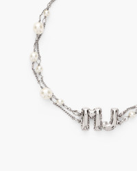 Description Industrial, punk-inspired, chains and layered into a double chain bracelet, contrasted with delicate pearls adorned throughout. A mylar balloon inspired MJ letter logo sits at the front. 2S6JBR001J40 Features Plated Brass Glass Pearls 100% Nickel Free Lobster Clasp Closure With Extender Chain Shipped In Our Signature Yellow Gift Box With Custom Monogram Dust Bag Dimensions Base Length: 7" (18cm) Extender: 1" (3cm) Pearl Stations: 3-5mm round