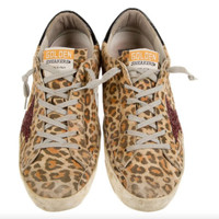 Super Star Glittered Leopard-print Leather Sneakers * Golden Goose Superstar Low Top Sneakers * Brown & Neutrals Leather * Animal Print * Rubber Trim * Embroidered, Cutout, Distressed, Glitter & Mesh Accents * Round-Toes * Lace-Up Closure at Uppers Size 39 Great Condition!