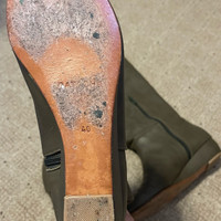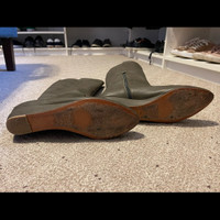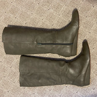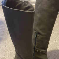 "Gray/green" like a taupe color Rear zip closure Leather uppers. Under the knee Excellent condition. Bought them in Argentina. Genuine leather. Size 40 (European) but would be like a US9.5 (I usually wear 8.5/9 and they fit a little loose on me)