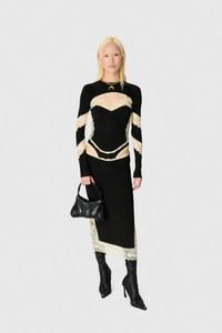 DRAPED JERSEY & LACE LS LONG DRESS