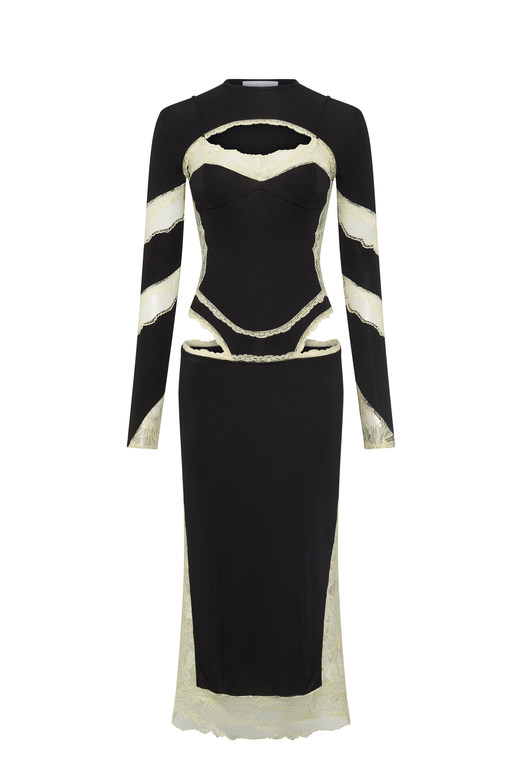 - Double collar with crew neck and V-neck - Set-in sleeves - Adjustable straps - Lace at the bottom of the garment - Illusion-effect briefs - Lace details Materials DRAPED JERSEY & LACE 95% VISCOSE 5% EA (FSC)