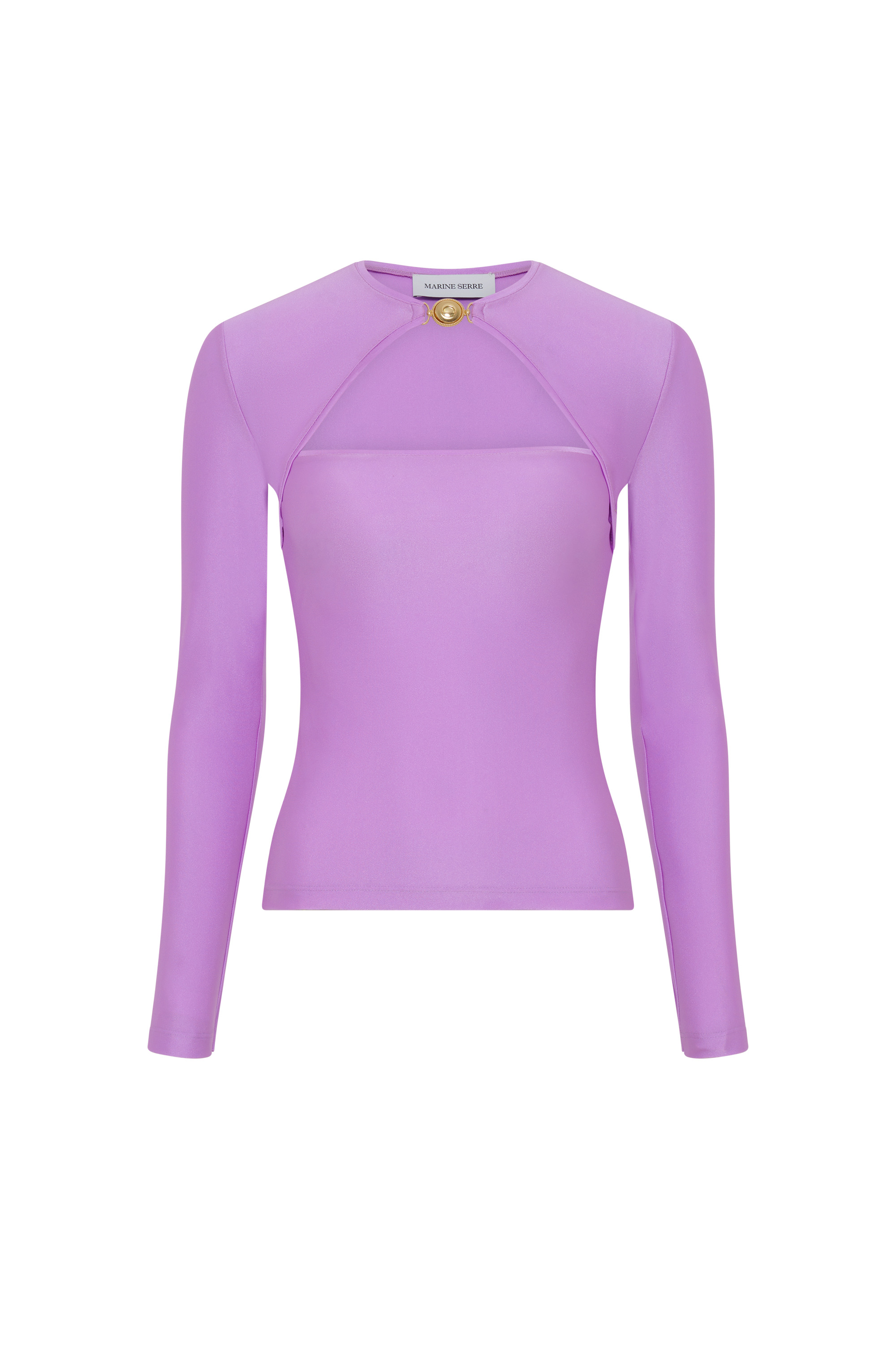 Fitted open chest top with a round neck and chest cutout The discount percentage displayed on Last Chance products is calculated based on the product's original selling price before markdowns. Product Detail - Moon jewelry clip closure at front neck - Extra long sleeves with thumbholes - Turned hem Composition and Traceability Product details page relating to environmental qualities or characteristics WTO429A RJER0018 PK35 SWEET LILAC Composition: 65% Polyamide, 35% Elastane Releases plastic microfibers into the environment when washing Traceability: Weaving/Dyeing: Belgium Manufacturing: Romania