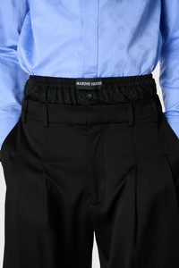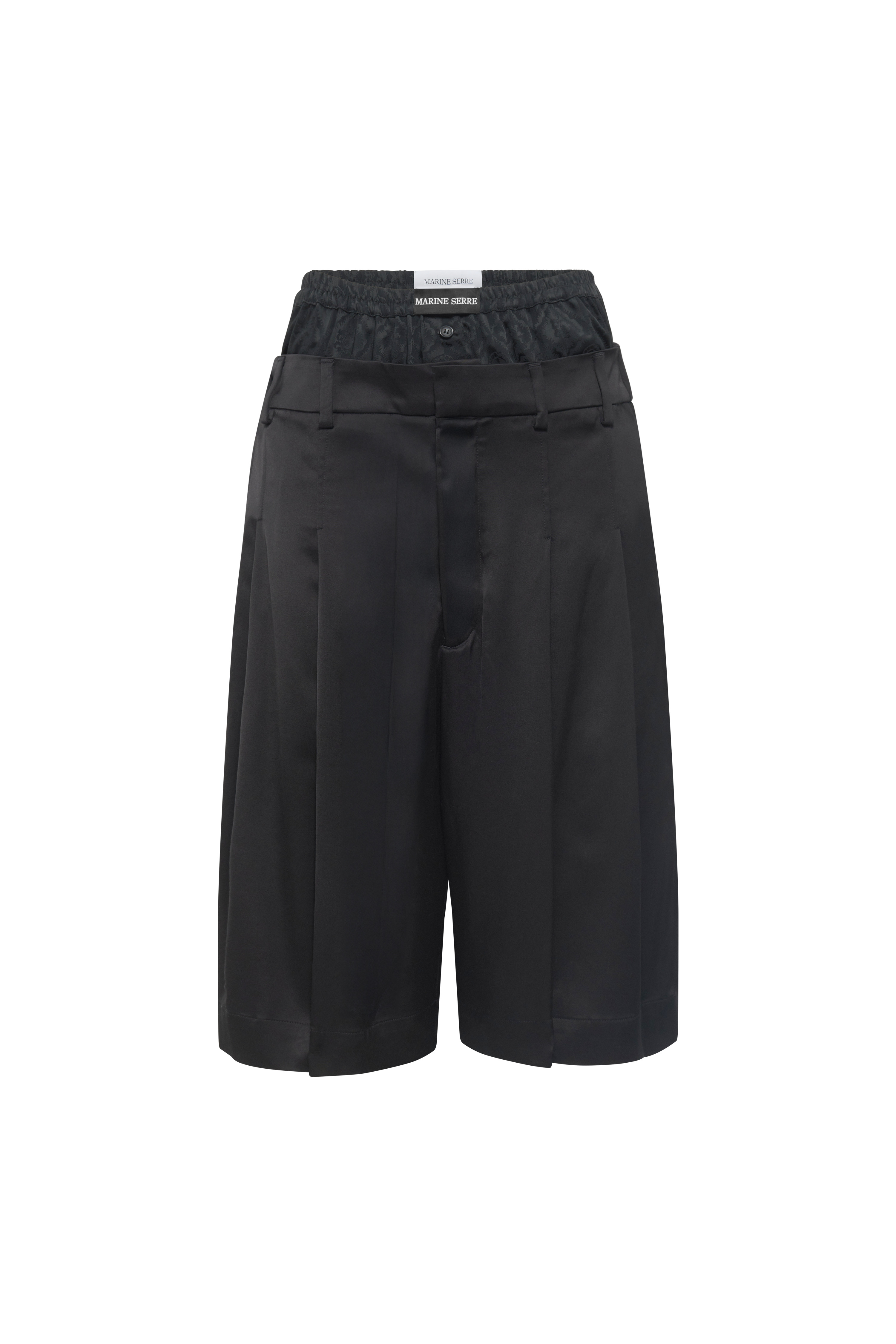 - Zipper and metallic hooks - Two Italian front pockets - Two welt back pockets - Belt loops - Signature Moon jacquard lining - Marine Serre tailoring label - Elasticated waistband with Marine Serre label Materials Moon Jacquard Satin 96% VISCOSE 4% EA