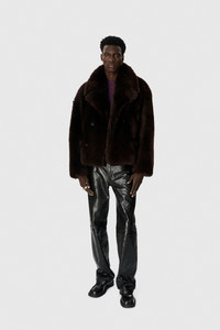 - Leather Buttons - Two Flap Pockets - Inside Pocket - Dropped Shoulders - Signature Moon Jacquard Lining - Marine Serre Leather Patch Materials Hairy Shearling Leather Brown Hairy shearling leather made from premium sheep and lamb hides, crafted in Italy. Naturally textured, fur-like surface offers visual richness and warmth. Contrasted with smooth lamb leather panels for a refined texture interplay. Fully lined in viscose for ease and a polished interior finish. Deep brown color enhances the texture and luxurious feel. Main Fabric: 100% Sheep Leather Second Fabric: 100% Lamb Leather Lining: 100% Viscose