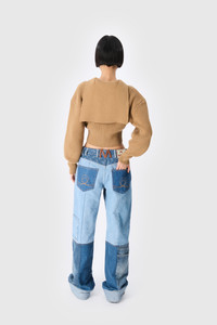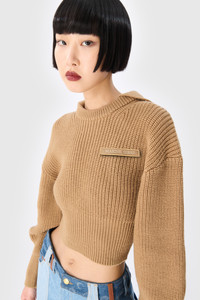- Dropped shoulders with oversized sleeves - Tight knit cuffs and hem - Branded velcro badge on left chest Materials Ms Half Cardigan Knit Camel The Half Cardigan Knit has been imagined as a wardrobe essential taking heavy inspiration from chunky thick sweaters of sailors. The simple mariner aesthetic was further explored with the addition of a velcro badge on the left chest. The badge can be switched out for a different one as the wearer pleases, or removed completely for a minimalist, brandless approach. 100% Wool Merinos