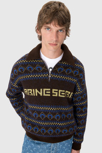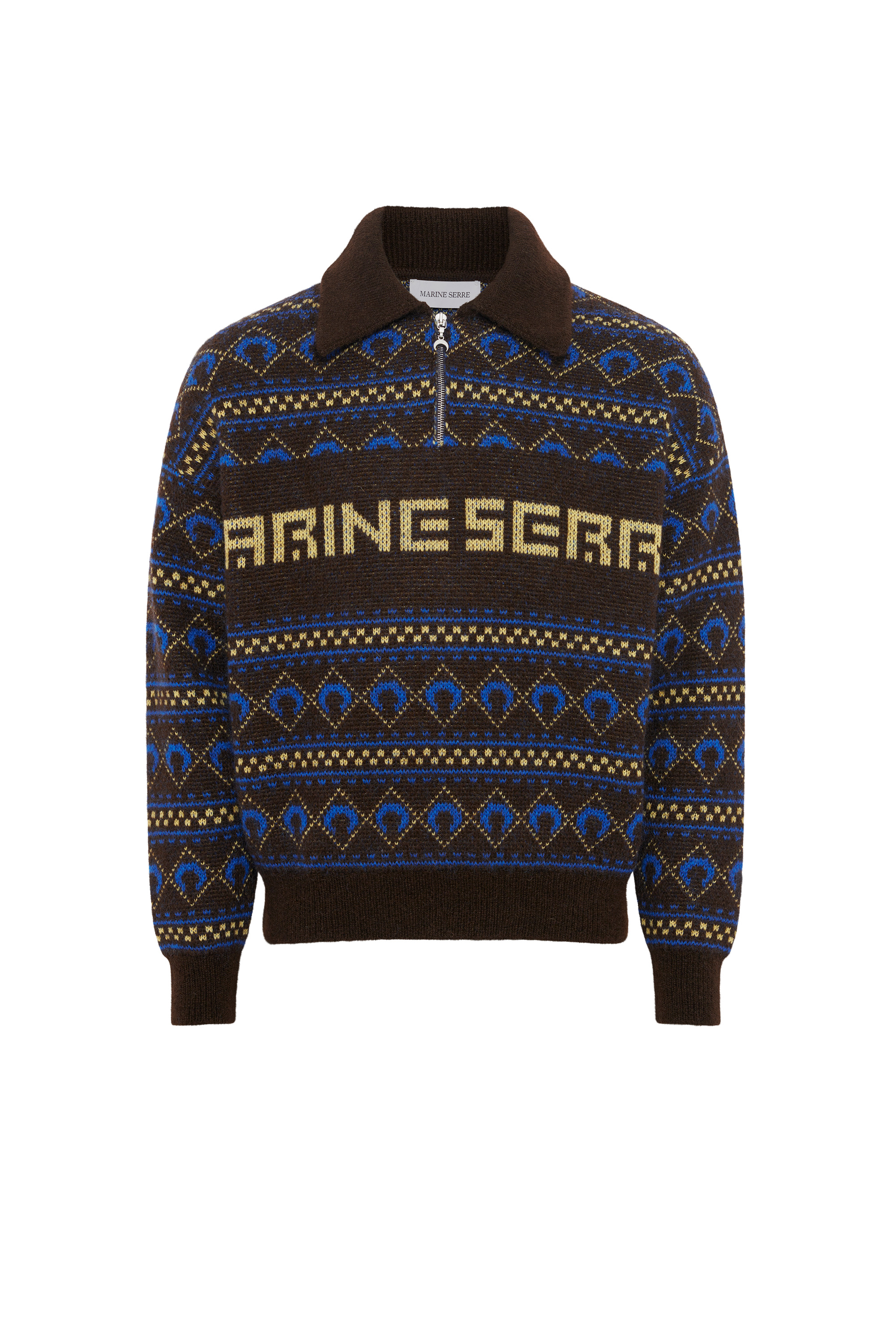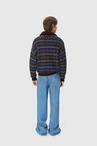 - Dropped shoulders with puffy sleeves - Ribbed polo collar with zipper closure - Ribbed cuffs and hem Materials MARINE SERRE JACQUARD KNIT A brand-new striped pattern has been devised and jacquard knit into a mohair blend yarn; the yarn’s soft and fuzzy feel is ideal for the off-season. The striped pattern on these garments not only echoes the glorious history of vintage ski sweaters, but also builds on a broader preppy aesthetic this season. Look closer and you’ll see a blue Marine Serre Moon surrounded by diamonds, plus the designer’s name running across the front of the pieces. 60% Wool, 25% Mohair, 15% Polyamide - Recycled
