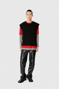 Classic long sleeve crewneck t-shirt with regular length Product Detail - Ribbed neckline - Dropped shoulders - Embroidered moon logo - Woven label on the back - Triple layers construction Composition and Traceability Product details page relating to environmental qualities or characteristics UTT011A RJER0023 GRB1 GREY/RED/BLACK Composition: 87% Merinos Wool , 13% Polyamide Traceability: Weaving, Dyeing, Manufacturing: Portugal