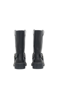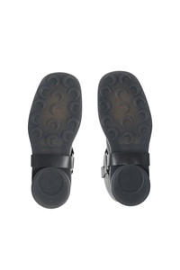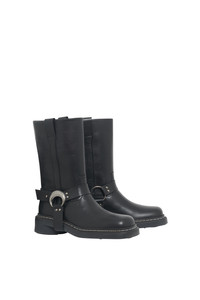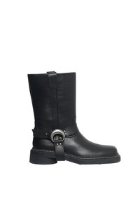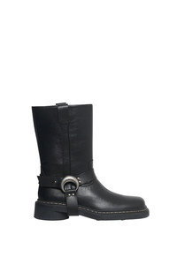 - Full leather upper construction - Square toe - Rubber platform sole with Moon all over - Removable strap with signature Moon charm - Mid-calf length - 4,5 cm heel Materials Metal Free Leather Ms Moto Black