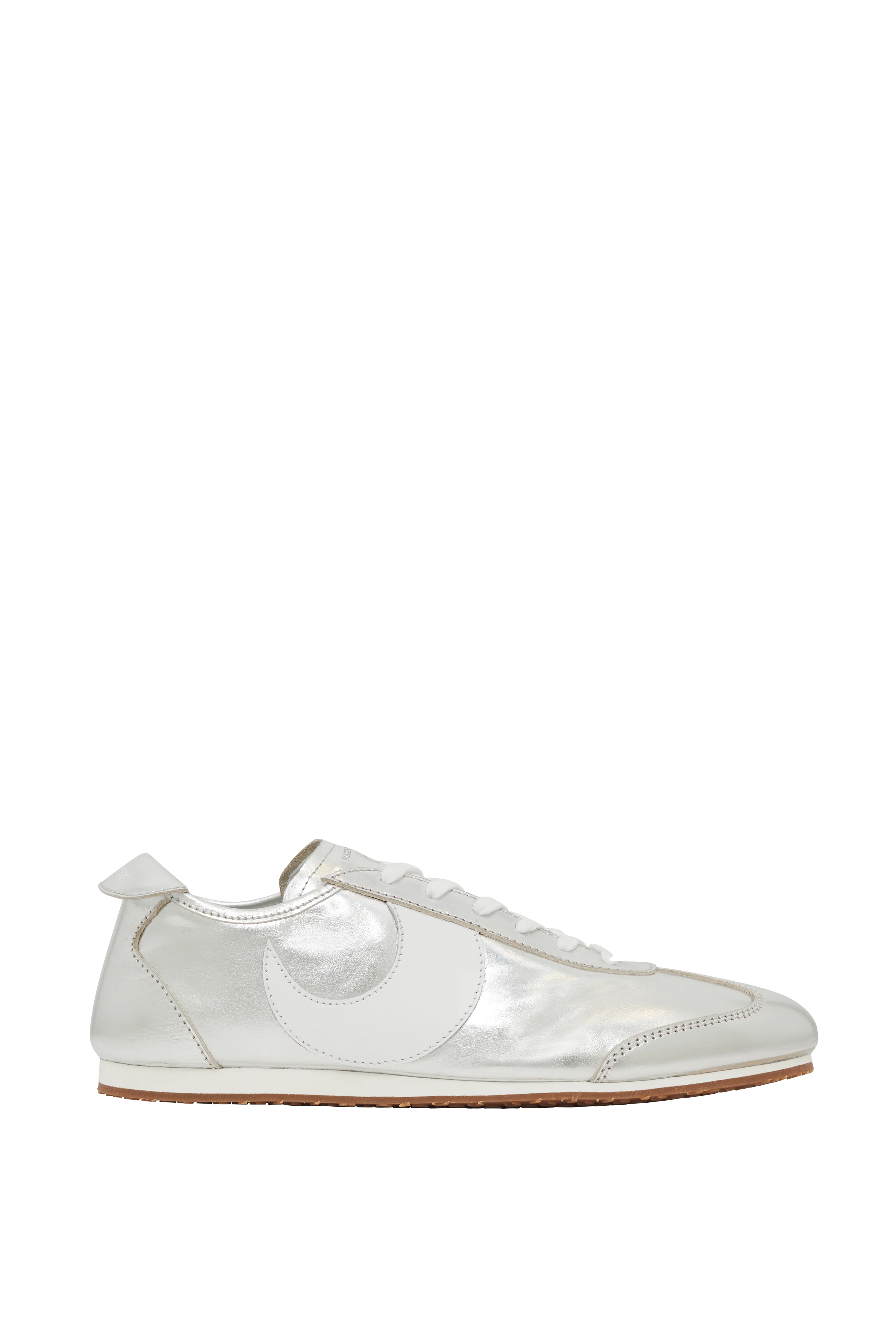 - Lace-up closure - 100% calfskin lining - Embossed ms logo Materials MS Astra Silver Sleek, elongated sneaker silhouette. Features a subtle moon logo patch on the side for a refined signature touch. Made from smooth leather in black or white, and in a bold silver metallic leather version. Fine rubber sole ensures a streamlined, lightweight profile. Minimalist aesthetic with a futuristic twist, echoing Marine Serre’s design codes. Combines everyday comfort with elevated, gender-fluid styling. 100% COW LEATHER SECOND FABRIC- 100% CALF LEATHER LINING- 100% CALF SKIN