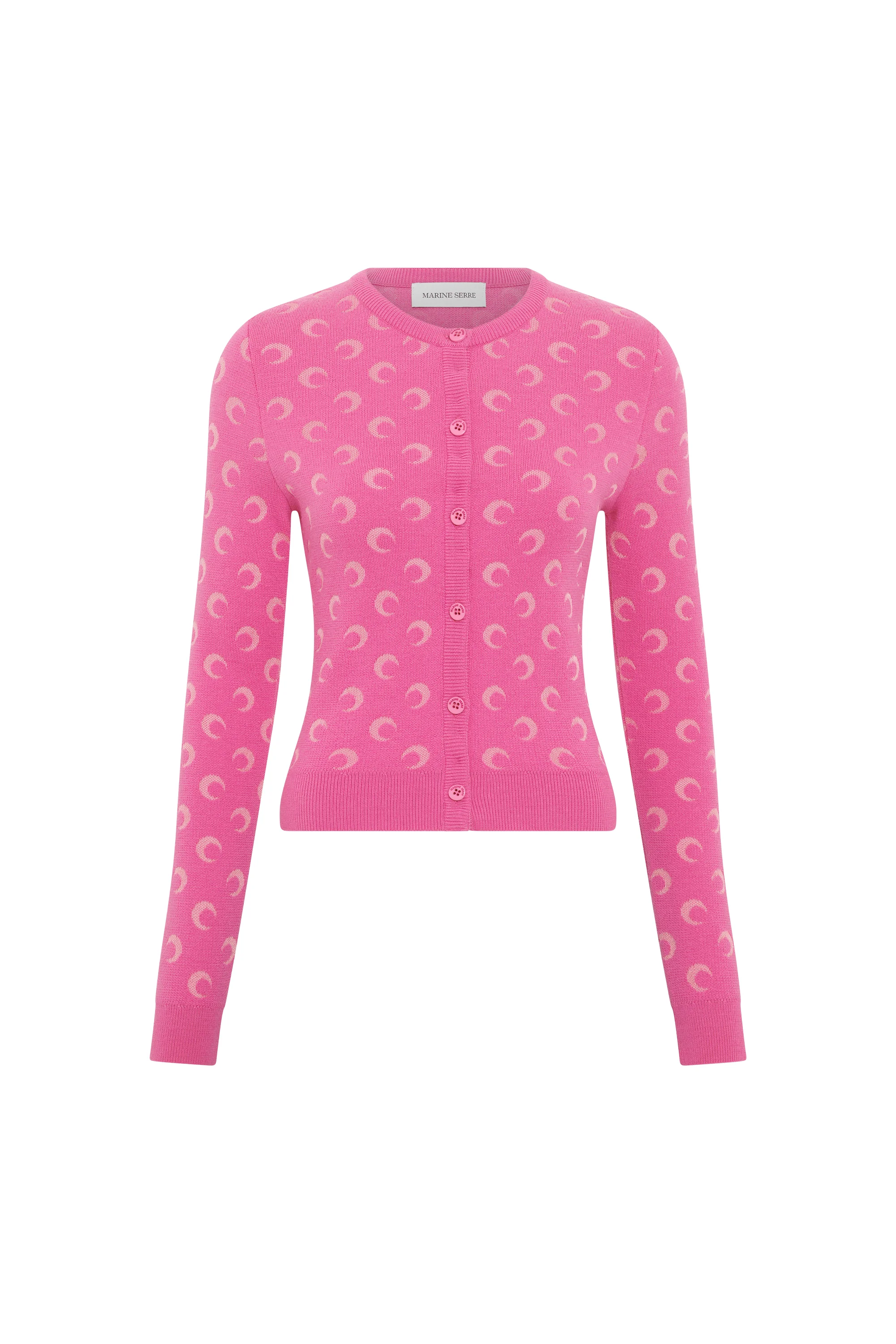 - Ribbed Neckline - Front Closure With 6 Engraved Buttons - Ribbed Sleeves And Bottom Finishings - Jacquard Stitch With All Over Moon Signature Artwork - Jacquard Moon Logo Materials Moon Jacquard Knit Pink Iconic All Over Moon motif adorns this blended FSC-approved viscose and wool yarn jacquard knit. The shapes present in this family run in parallel to those in the wider Moon Logo range and serve to accentuate the collection’s idea of translation and metamorphosis, almost as if our iconic Recycled Moon Jersey magically transformed into knitwear. The line has a strong sportswear dynamic with the addition of thumbholes in some of the pieces. This wool blend jacquard knit is slightly warmer and thicker than the Moon Logo Knit, however, but also so incredibly soft that it can also be worn directly on the skin. 50% Viscose (FSC Certified), 50% Virgin Wool