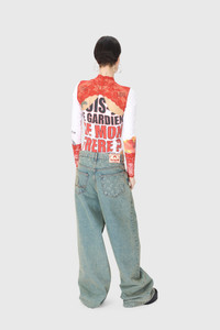 - Five pockets - Shank buttons front closure - Cut-out on bottom hem - Belt loops - Embroidery on back left pocket - Branded jacron woven on back waistband - Signature Moon laser printed all over under the belt and on pockets - Logo engraved on button Materials Moon Laser Denim Beige The appeal of our All Over Moon denim never wanes, with this classic fabric returning again and again. Made from a GOTS-certified organic cotton canvas, our indigo denim is stonewashed to produce a light blue, sand and purple blue shades; the latter is also treated with a pigment spray to achieve a really vibrant gradient effect that fades to a paler purple at the sides of the garment. After stonewashing, the All Over Moon is laser-printed onto the pieces, its placement differing for each. All are finished with red reinforcement stitches, logo-engraved metal buttons, and a Marine Serre jacron back patch. 100% Coton (GOTS Certified)