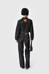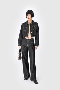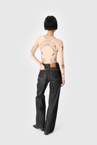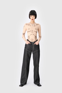 - Cutout at hip - Front felted seams - Four pocket jeans - Five button closure - Moon allover laser printed denim on front pockets and right back pocket - Belt loops - Embroidery on back pocket - Jacron with logo on back belt - Logo engraved on buttons Materials Moon Laser Denim Black 100% Cotton