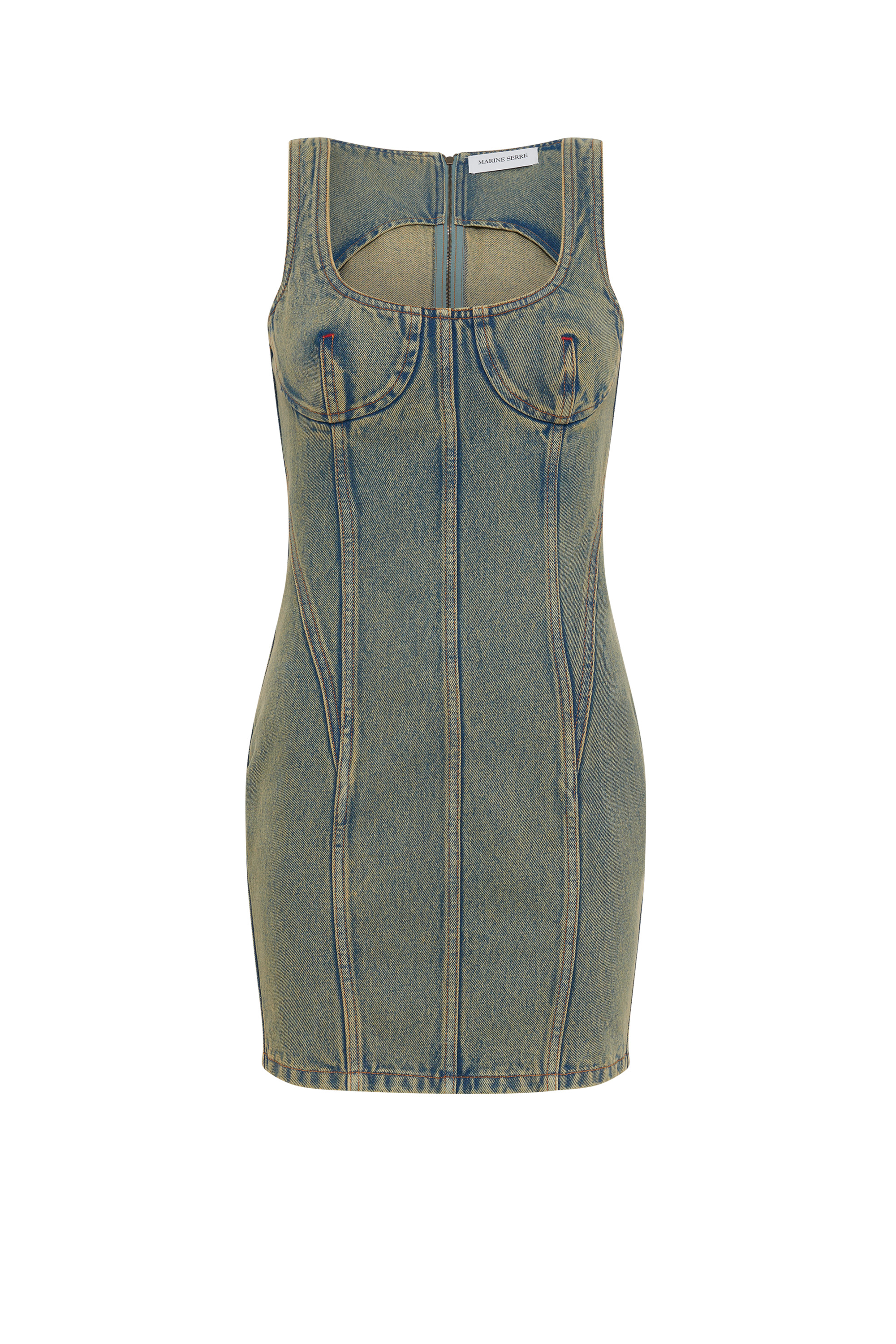 - Zipped back with signature Moon puller - Princess seams contour the bustier - Corset-like structure enhances the silhouette - Branded jacron woven on back hem Materials Moon Laser Denim The appeal of our All Over Moon denim never wanes, with this classic fabric returning again and again. Made from a GOTS-certified organic cotton canvas, our indigo denim is stonewashed to produce a light blue, sand and purple blue shades; the latter is also treated with a pigment spray to achieve a really vibrant gradient effect that fades to a paler purple at the sides of the garment. After stonewashing, the All Over Moon is laser-printed onto the pieces, its placement differing for each. All are finished with red reinforcement stitches, logo-engraved metal buttons, and a Marine Serre jacron back patch. 100% Coton (GOTS Certified)