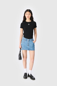 Fitted mini skirt Product Detail - Five pockets - Zipped closure with shank button - Moon allover laser printed denim on front and back panel - Belt loops - Embroidery on back pocket - Jacron with logo on back belt - Logo engraved on button Composition and Traceability Product details page relating to environmental qualities or characteristics WSK057A CDEN0002 BL05 LIGHT BLUE Composition: Base Material: 100% Cotton - Secondary Fabric: 100% Cotton Product not containing recycled material Traceability: Weaving: Morocco Dyeing/Manufacturing: Italy