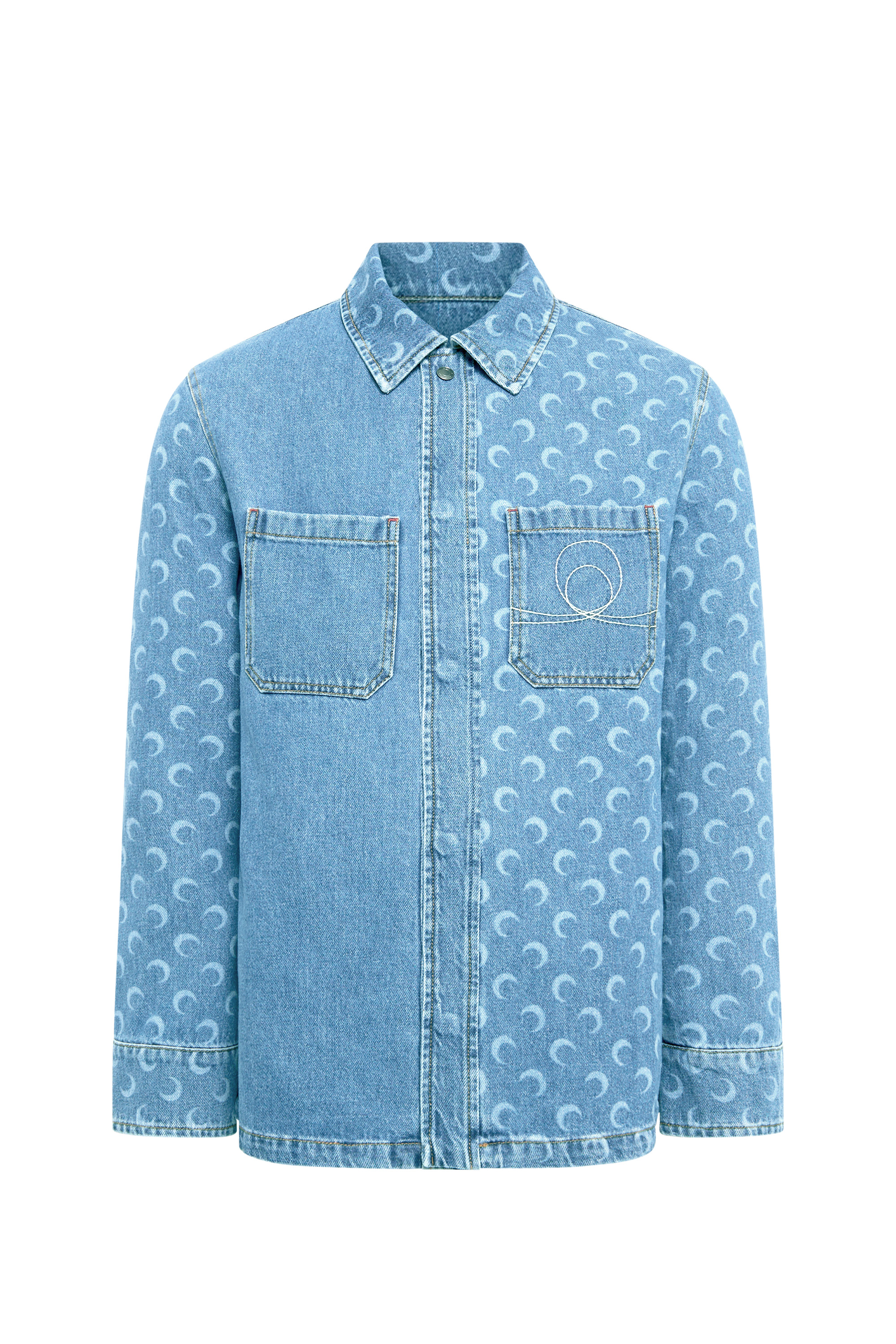 - Snap button front closure - Two pockets at chest - Snap button cuffs - Moon allover laser printed denim on left side and back yoke - Embroidery on front left pocket - Jacron with logo in center back Materials Moon Laser Denim Blue Marine Serre offers a 100% GOTS Certified Organic denim twill family of garments, in addition to a Regenerated one. For this new family of denims, Marine Serre has opted for a light washed classic indigo as well as a striking black variant. 100% Cotton (GOTS Certified)
