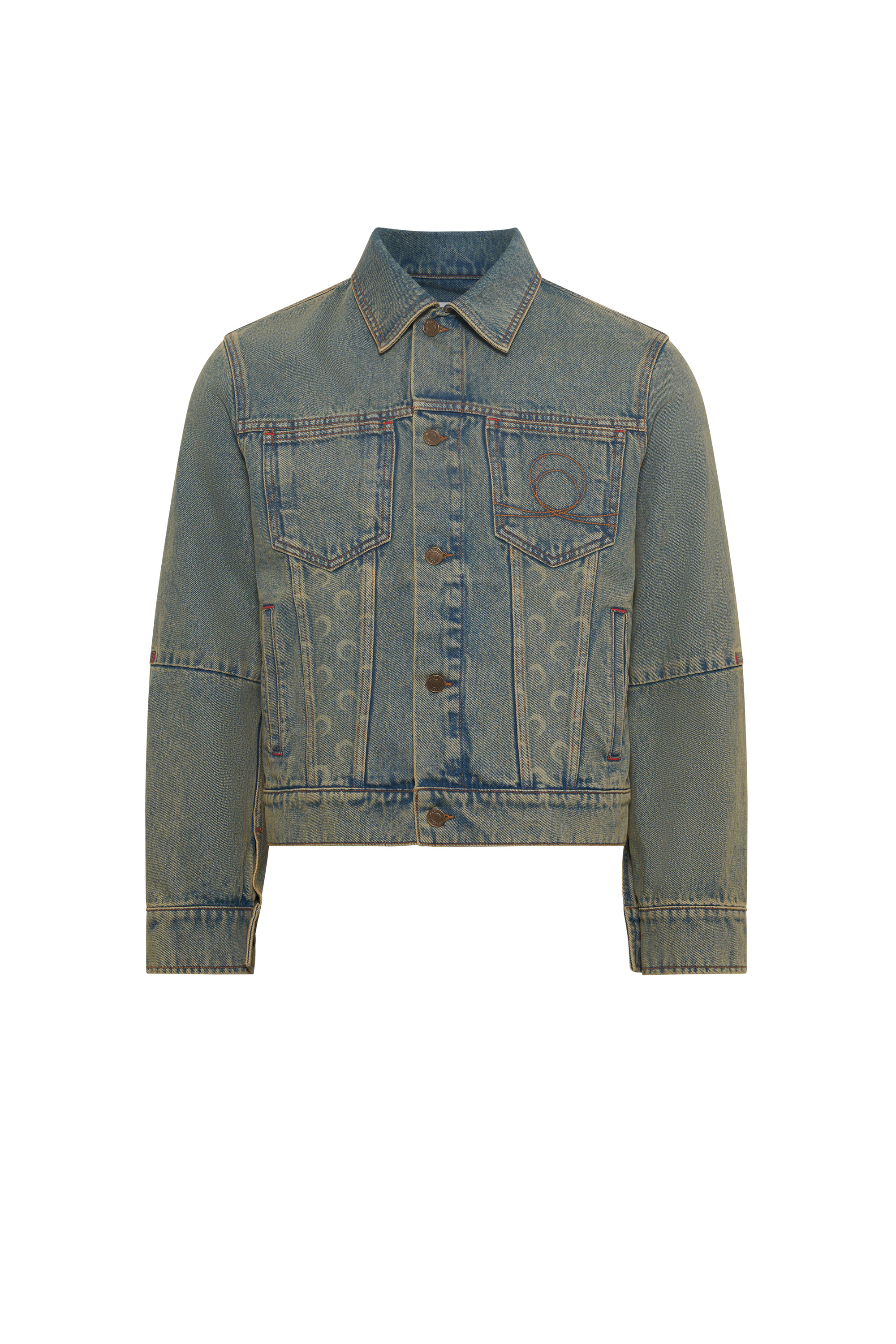 Regular fit trucker jacket with a shirt collar The discount percentage displayed on Last Chance products is calculated based on the product's original selling price before markdowns. Product Detail - Buttoned front - Two chest pockets - Welted side pockets - Buttoned sleeve cuffs - Middle cut on sleeves - Adjustable waist - Embroidery on front left pocket - Branded jacron woven under neck in back - Signature Moon laser printed all over on front yoke - Logo engraved on buttons Composition and Traceability Product details page relating to environmental qualities or characteristics MJA063A CDEN0003 BG10 LIGHT BEIGE Composition: Base Material: 100% Cotton - Lining: 100% Cotton Traceability: Weaving/Dyeing: Morocco Manufacturing: Italy
