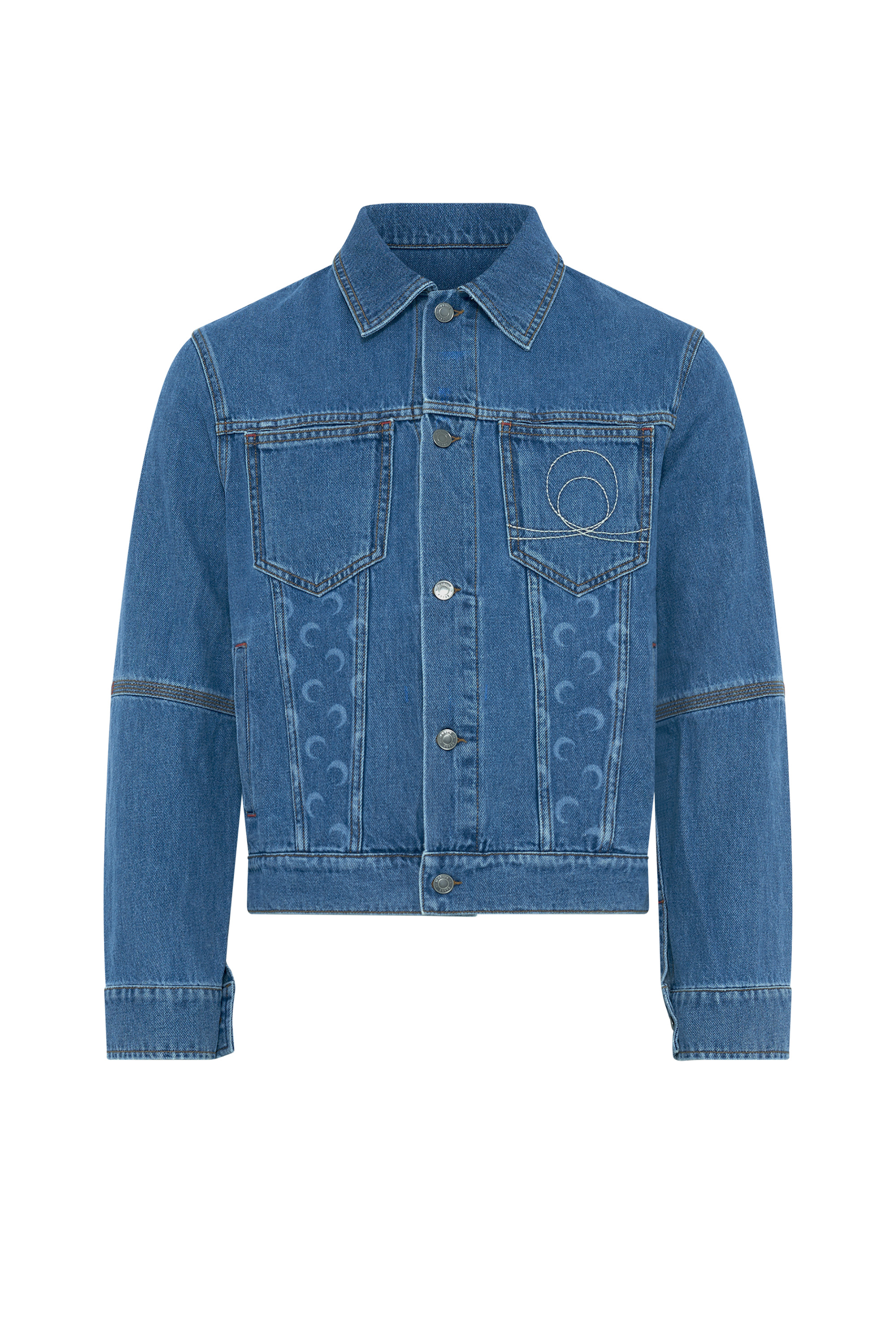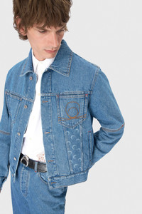 - Five button front - Two pockets at chest - Two side pockets - Buttoned cuffs - Moon allover laser printed denim on front yoke - Adjustable waist - Embroidery on front left pocket - Jacron with logo in center back - Logo engraved on buttons Materials Moon Laser Denim Blue Marine Serre offers a 100% GOTS Certified Organic denim twill family of garments, in addition to a Regenerated one. For this new family of denims, Marine Serre has opted for a light washed classic indigo as well as a striking black variant. 100% Cotton