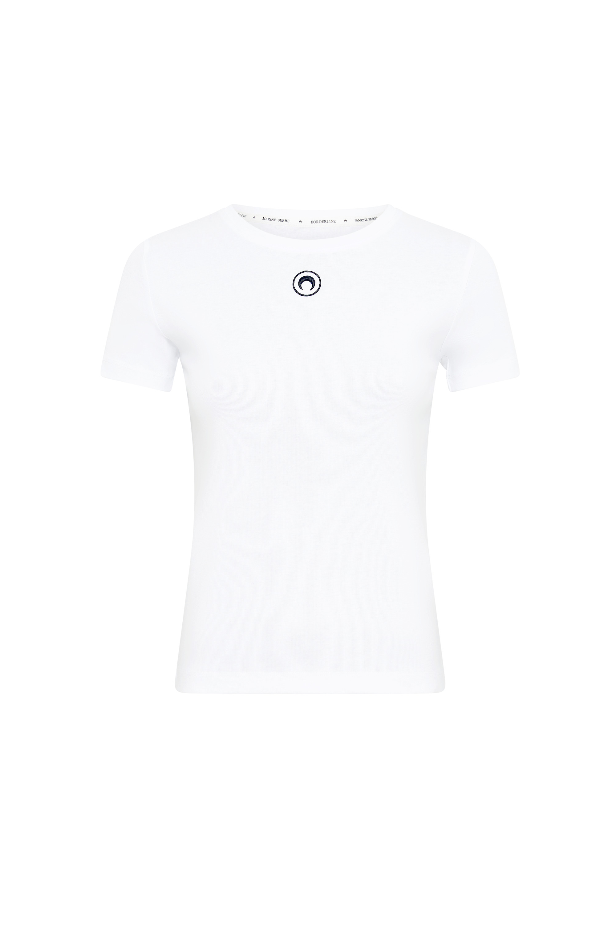 - Ribbed neckline - Moon logo embroidered under neck in front - Branded label woven under neck in back Materials White Organic Cotton All of the cotton that Marine Serre sources for the BORDERLINE collection is certified GOTS (Global Organic Textile Standard). This certification is the worldwide leading textile processing standard for organic fibers and provides credible assurance of responsible manufacturing with the least chemical inputs. In terms of shapes, the House proposes a wide range of everyday styles taken directly from the sportswear universe. 100% Cotton (GOTS Certified)