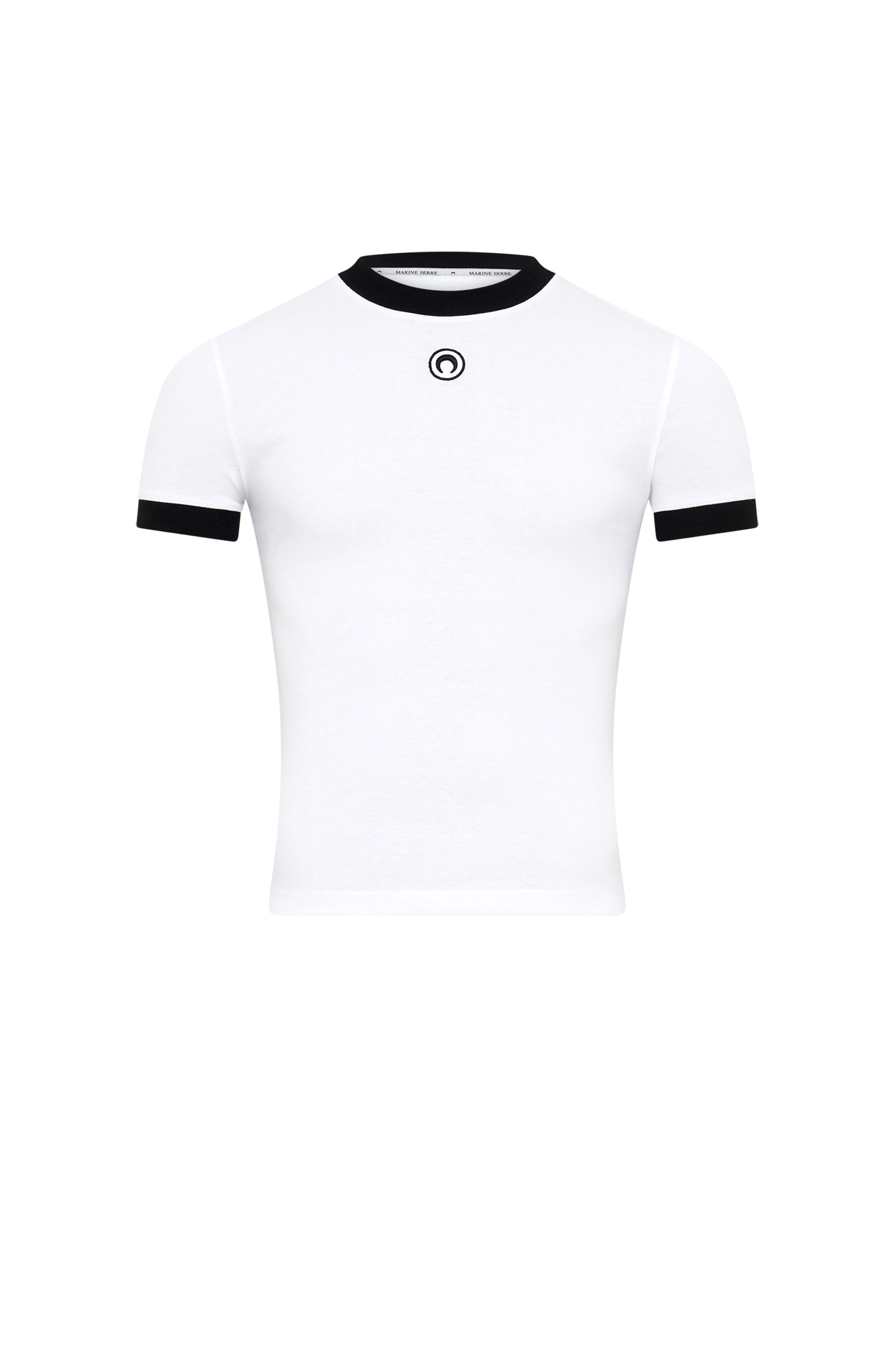 - Ribbed neckline and cuffs - Contrasted finishings - Moon logo embroidered under neck in front - Branded label woven under neck in back Materials Moon Logo Jersey All the cotton Marine Serre sources for Borderline is GOTS-certified — this world-leading textile processing standard chiming with the house’s own well-known commitment to protecting the planet. In terms of the silhouettes across these ranges, we wanted to offer a wide range of everyday styles that are directly inspired by the world of sportswear. Our Moon Logo Jersey lines come in a range of traditional colours (white, black and grey, but in most cases lilac too) spun out across t-shirts, tanks and dresses, as well as underwear. These garments are finished in the classic way familiar from sportwear garments, with our Moon Logo in raised embroidery just below the neckline. Some of the Recycled Cotton Jerseys (lilac and grey) feature our MS Sport logo — a print moon with Marine Serre embroidered above, and we have also expanded our palette with seasonal colours such as red and blue, bearing a Gradient All Over Moon print. 100% Organic Cotton (GOTS certified)