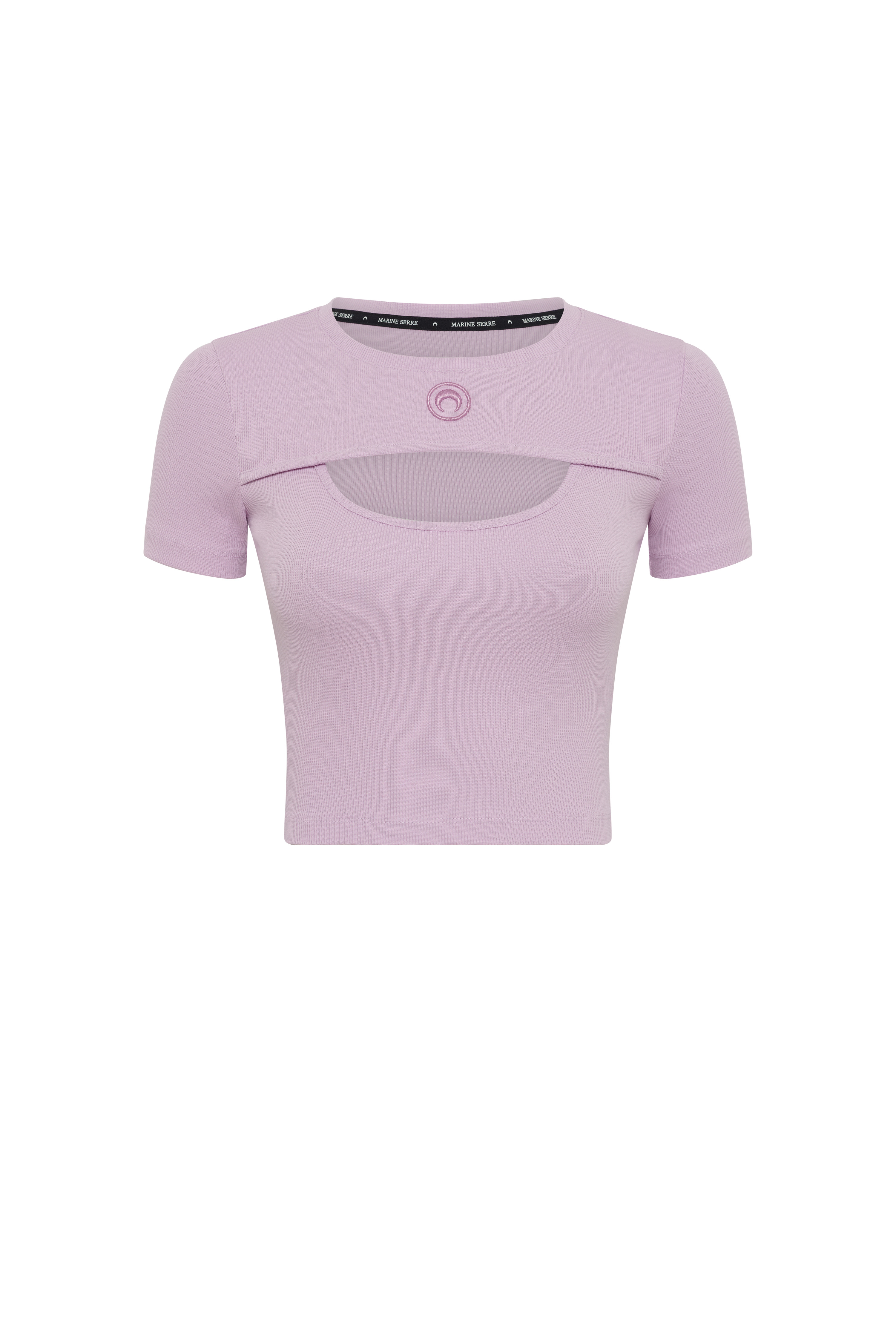 - Ribbed neckline - Baby fit construction - Layered cutout in front - Moon logo embroidered under neck in front - Branded label woven under neck in back Materials Moon Logo Jersey All the cotton Marine Serre sources for Borderline is GOTS-certified — this world-leading textile processing standard chiming with the house’s own well-known commitment to protecting the planet. In terms of the silhouettes across these ranges, we wanted to offer a wide range of everyday styles that are directly inspired by the world of sportswear. Our Moon Logo Jersey lines come in a range of traditional colours (white, black and grey, but in most cases lilac too) spun out across t-shirts, tanks and dresses, as well as underwear. These garments are finished in the classic way familiar from sportwear garments, with our Moon Logo in raised embroidery just below the neckline. Some of the Recycled Cotton Jerseys (lilac and grey) feature our MS Sport logo — a print moon with Marine Serre embroidered above, and we have also expanded our palette with seasonal colours such as red and blue, bearing a Gradient All Over Moon print. 100% Organic Cotton (GOTS certified)