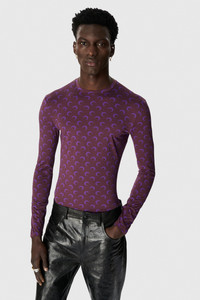 Second skin regular length top with crewneck and long sleeves Product Detail - Neck finished with bias - All over moon printed Composition and Traceability Product details page relating to environmental qualities or characteristics MTS003A_CJER0001_PU70_AUBERGINE Composition: 88% Polyamide, 12% Elastane Recycled material: 88% (Polyamide) Releases plastic microfibers into the environment when washing Traceability: Weaving/Dyeing: Italy Manufacturing: Portugal