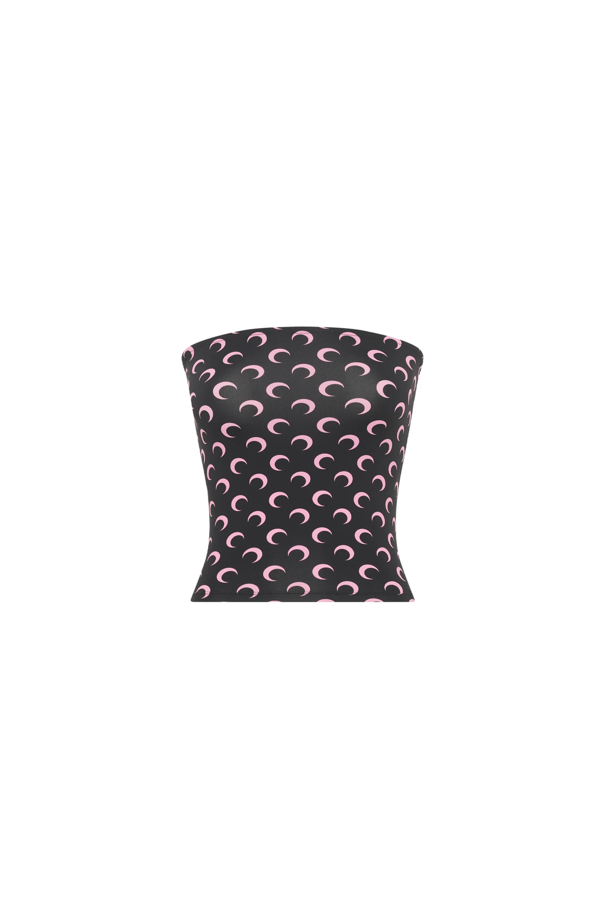 Sleeveless second skin cropped bustier top Product Detail - Elastic band with anti-slip tape inside - All over moon printed Composition and Traceability Product details page relating to environmental qualities or characteristics WTS011A_CJER0001_BK90_BLACK/PINK Composition: 84% Polyamide, 16% Elastane Product care: MACHINE WASH 30° Traceability: Weaving/Dyeing: Italy Manufacturing: Portugal