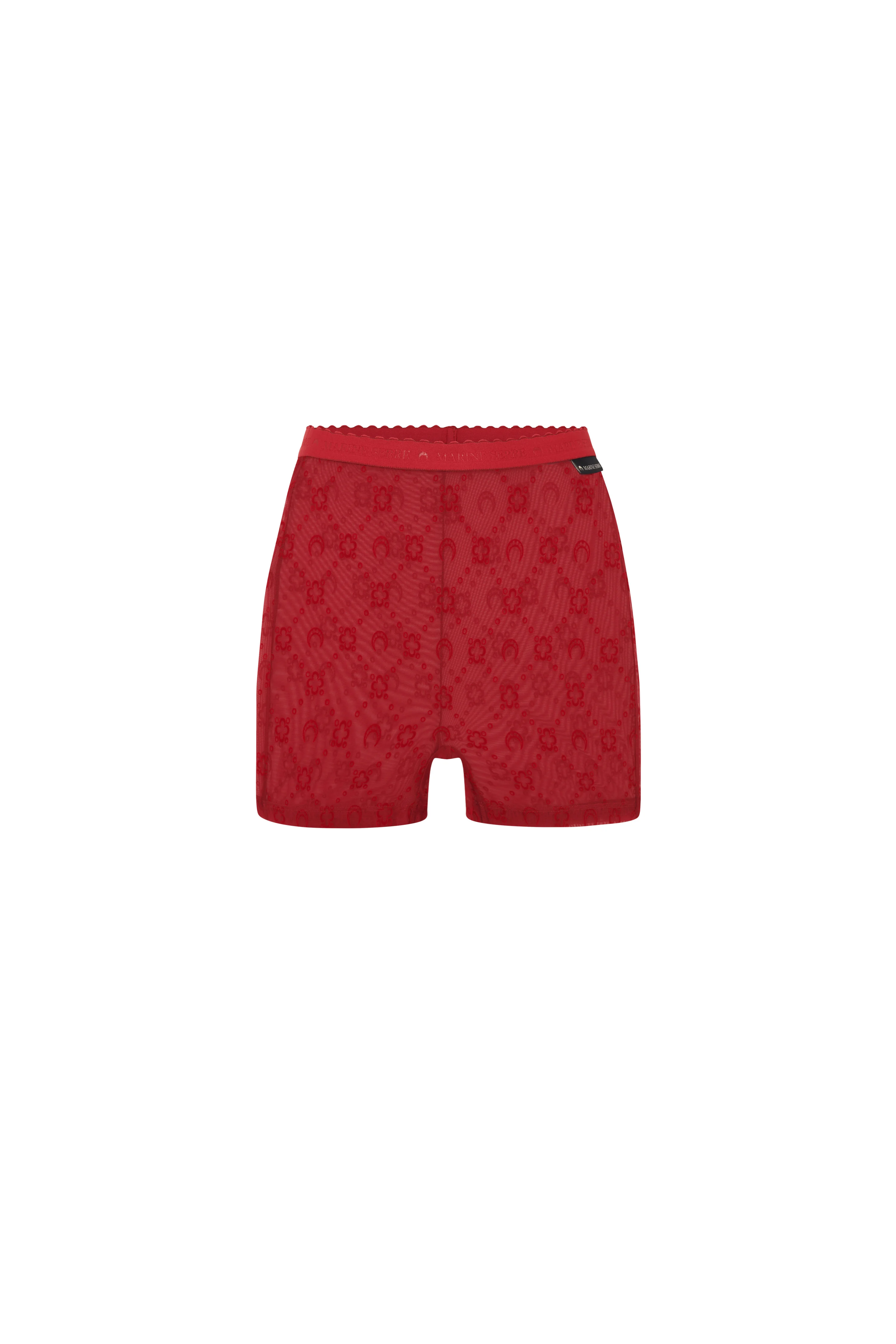 Second skin high-waisted mini shorts Product Detail - Elasticated waistband - Moonogram flocked Composition and Traceability Product details page relating to environmental qualities or characteristics WSH012A_CJER0005_RD11_RIBBON_RED Composition: Main Fabric: 86% Polyamide - Recycled, 14% Elastane Product Care: Gentle hand wash Do not bleach Low temperature iron on reverse side Dry clean with precaution Do not tumble dry Traceability: Weaving/Dyeing/Manufacturing: France