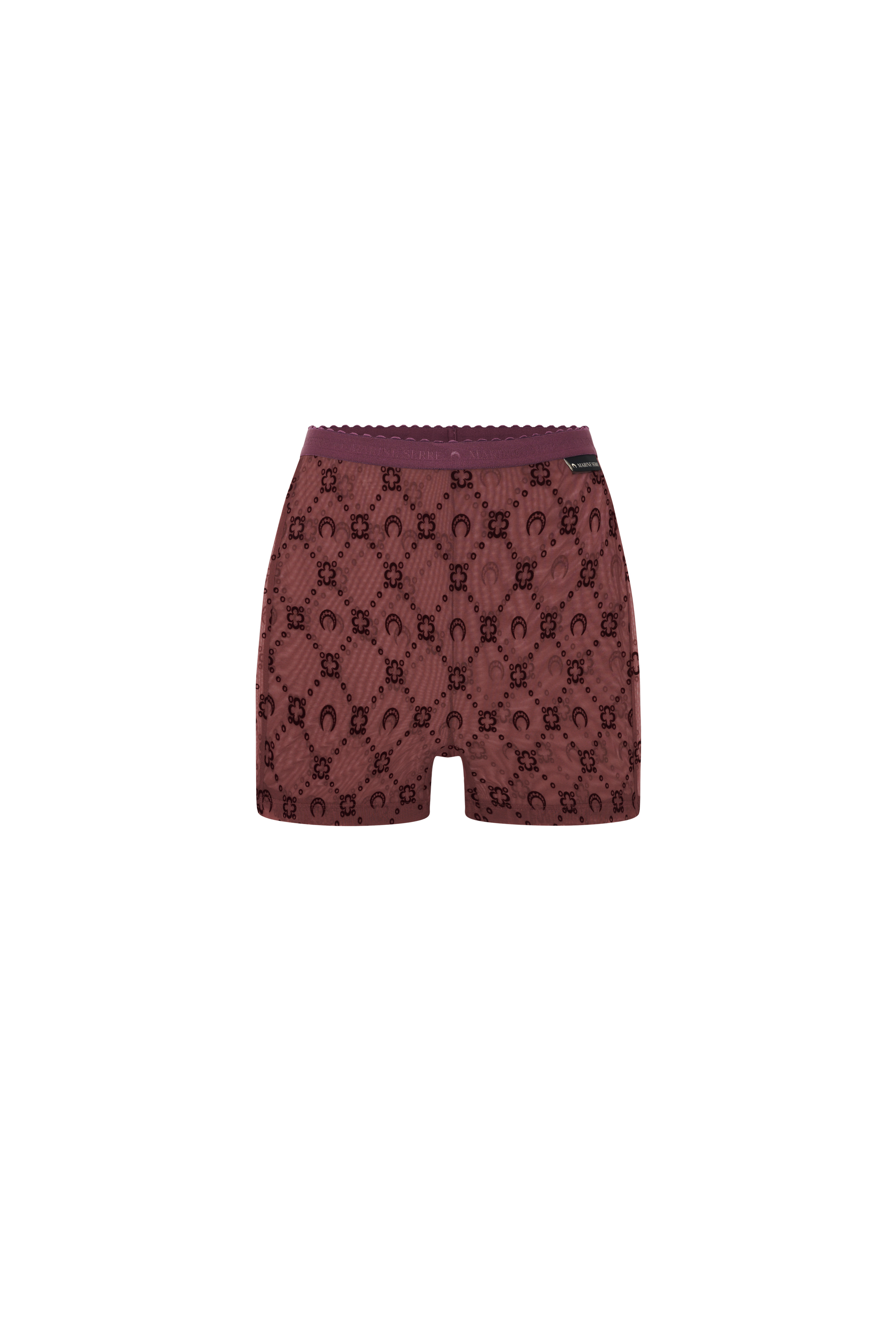 - Elasticated waistband - Moonogram flocked Materials Moonogram Flock Mesh Aubergine The Moonogram motif is flocked with soft velvet on our recycled mesh jersey, creating an incredibly comfortable fabric. The mesh’s transparency calls back to Marine Serre’s transgressive vision by having a material traditionally used solely for lingerie reimagined as day-to-day wear. 86% PA, 14% EA