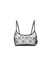 Second skin bralette with spaghetti shoulder straps Product Detail - Adjustable elastic straps - Moonogram flock allover - Elastic with logo in hem Composition and Traceability Product details page relating to environmental qualities or characteristics WUW058A_CJER0005_BK99_BLACK Composition: 86% Polyamide, 14% Elastane Recycled material: 86% (Polyamide) Releases plastic microfibers into the environment when washing Traceability: Weaving, Dyeing, Manufacturing: Italy
