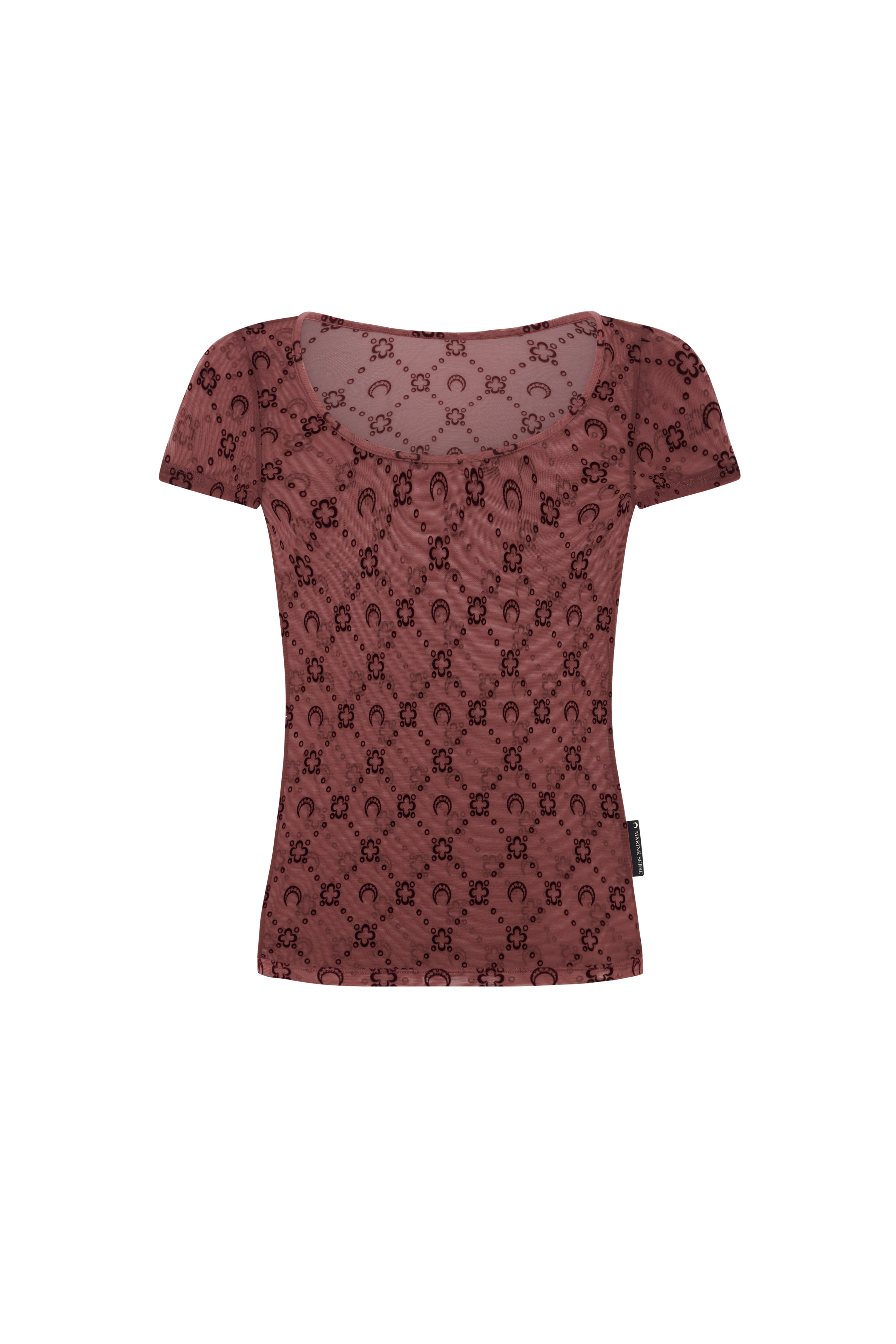 - Reinforced neckline - Moonogram flocked - Branded label woven on left side seam Materials Moonogram Flock Mesh Aubergine The Moonogram motif is flocked with soft velvet on our recycled mesh jersey, creating an incredibly comfortable fabric. The mesh’s transparency calls back to Marine Serre’s transgressive vision by having a material traditionally used solely for lingerie reimagined as day-to-day wear. 86% PA, 14% EA
