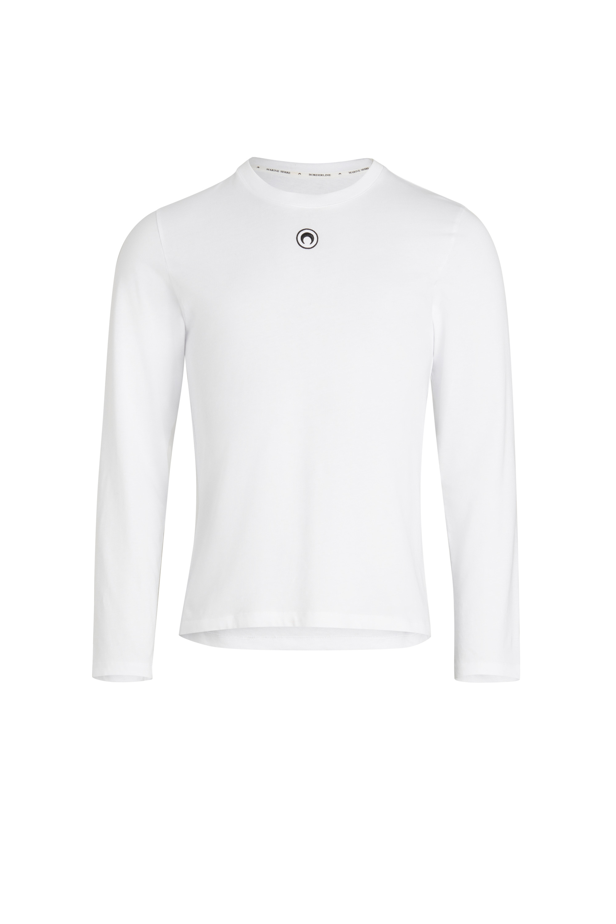 - Ribbed crewneck collar - MARINE SERRE bias around collar continuing on the shoulders - Cover stitched hem and cuffs - Contrasted black circle Moon logo embroidery placed below the front collar in center - MARINE SERRE Borderline label on the top back Materials White Organic Cotton All of the cotton that Marine Serre sources for the BORDERLINE collection is certified GOTS (Global Organic Textile Standard). This certification is the worldwide leading textile processing standard for organic fibers and provides credible assurance of responsible manufacturing with the least chemical inputs. In terms of shapes, the House proposes a wide range of everyday styles taken directly from the sportswear universe. 100% Cotton (GOTS Certified)