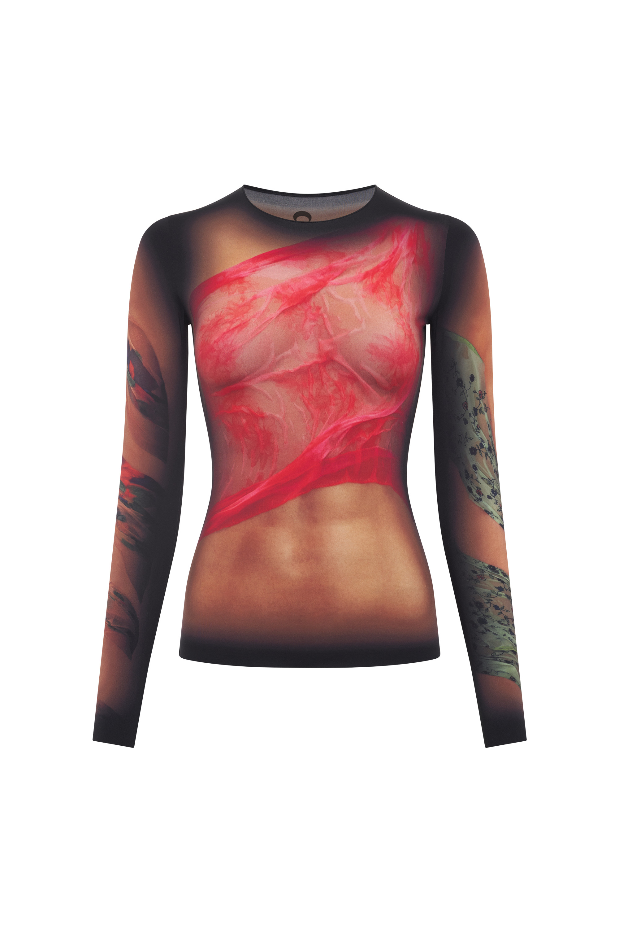 - DRAPED STATUE artwork in trompe l'oeil placement - Reinforced neckline - Cuffs and hem finished with raw edges Materials Recycled Draped Statue Jersey Trompe l’oeil prints have been one of the tricks in Marine Serre’s playbook since the beginning. The inspiration for this line came from the almost impossibly perfect bodies of statues — think Michaelangelo’s David — which we have recreated as a digital print on our recycled technical jersey. The jersey mesh creates a strong chiaroscuro effect across the garments, as black shadows deepen at the sides of the torso, neck, arms and hems. The prominent abdominal muscles (no gym membership required) add to the sporty-yet-artistic effect, with digitally printed scarves ‘draped’ diagonally across the bust, arms or (in the case of the catsuit and leggings) the crotch and legs. A seasonal tube dress echoes the top half of the crewneck and catsuit but adds a sari-style skirt with florals and netting to underscore the travel cues of the wider collection. The men’s high-neck top also picks up on the netting and is a more minimal club-ready design. 88% Polyamide, 12% Elastane Recycled material: 88% (Polyamide) Releases plastic microfibers into the environment when washing Polyamide is certified GRS.