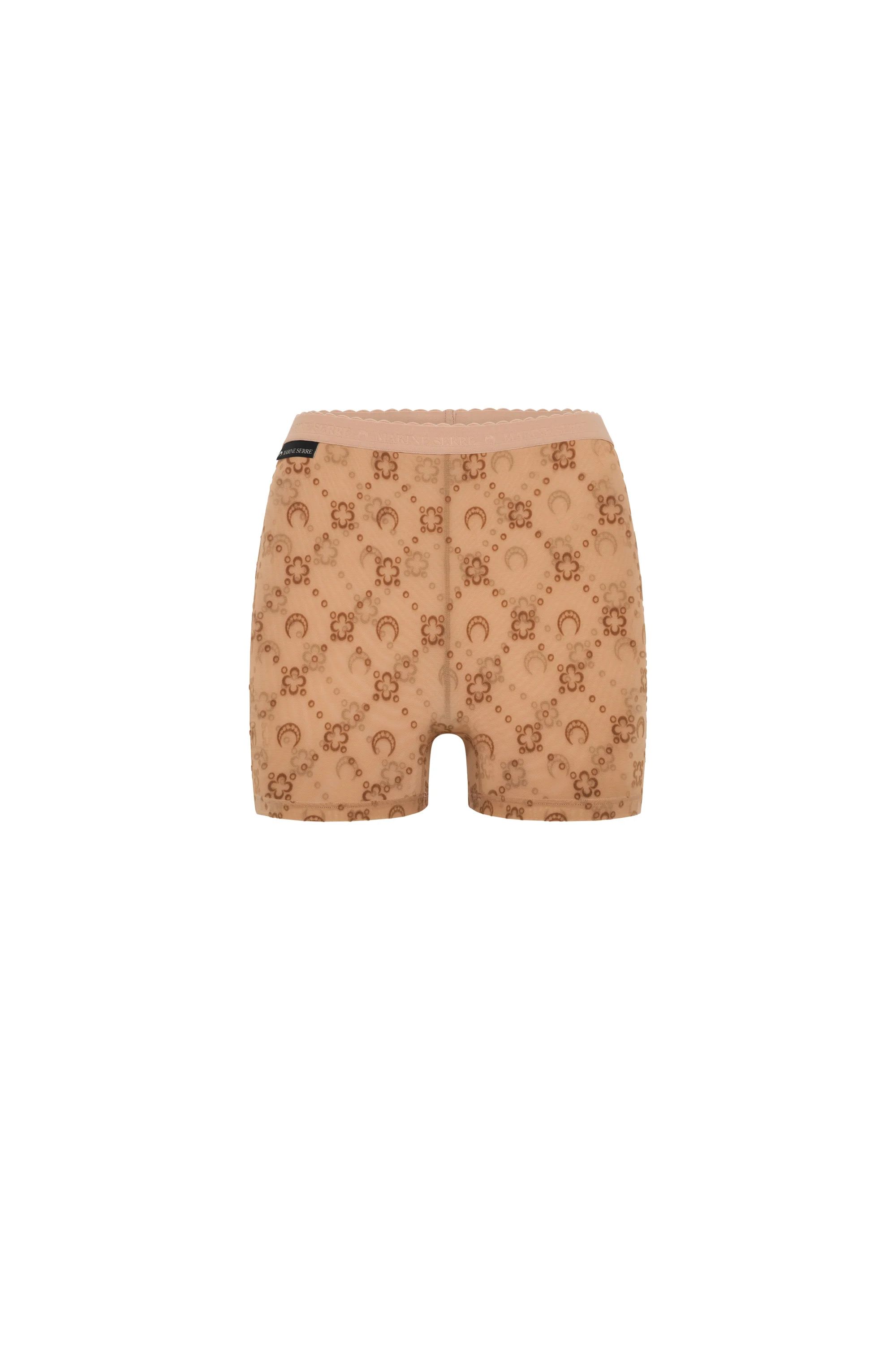 Second-skin high-waisted biker shorts Product Detail - Elastic waistband - Moonogram flock allover - Logo stamped on waistband - Label with logo on front left below elasticated waistband Composition and Traceability Product details page relating to environmental qualities or characteristics WSH012A CJER0005 BG60 CAMEL Composition: 86% Polyamide, 14% Elastane Recycled material: 86% (Polyamide) Releases plastic microfibers into the environment when washing Traceability: Weaving/Dyeing: Italy Manufacturing: France