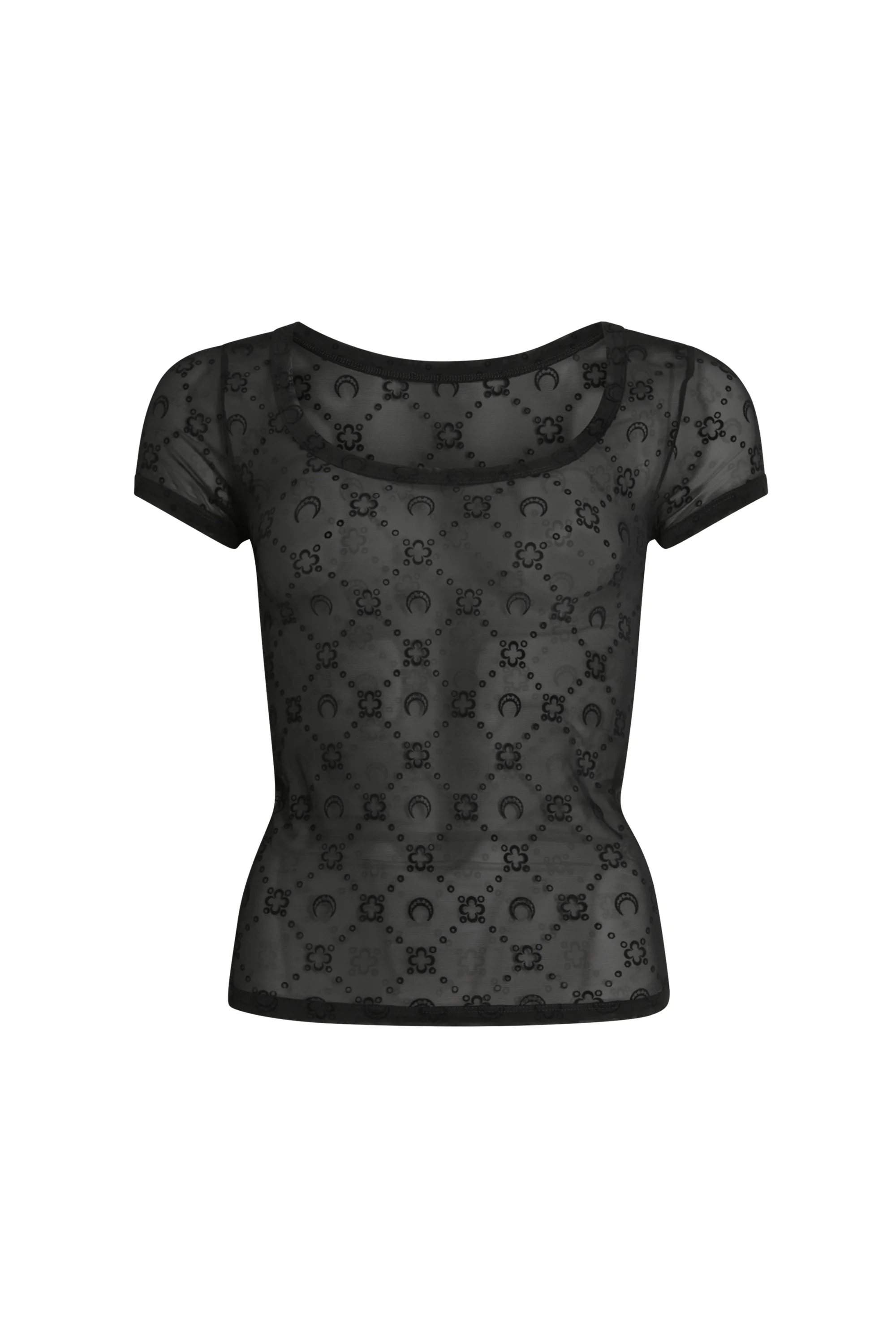 Second-skin top with an open neck and short sleeves Product Detail - Signature Moonogram flocked all over - Reinforced neckline - Branded label woven on left side seam Composition and Traceability Product details page relating to environmental qualities or characteristics WTO389A CJER0005 BK99 BLACK Composition: 86% Polyamide, 14% Elastane Recycled material: 86% (Polyamide) Releases plastic microfibers into the environment when washing Traceability: Weaving/Dyeing: Italy Manufacturing: France