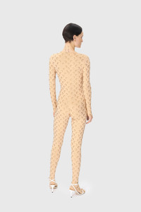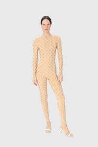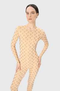 - Signature Moon rhinestoned all over - Reinforced neckline - Cuffs and hem finished with raw edges - Invisible zip in the back Materials RECYCLED MOON STRASS JERSEY The Rhinestoned All Over Moon print was first unveiled via a special couture catsuit during our Rising Shelter show (F/W 2023). Since then, the house has been busily working on research and development with the idea of translating the print to our ready-to-wear line. To this end, especially for this project, the team has forged ties with an artisanal workshop in India that specializes in the luxurious artisanal craft of embellishment; venturing into this partnership is very much in line with our ongoing support for superb craftmanship and our wish to embrace fashion with a rich story and heritage. Amazingly, it can take an artisan between eight and ten hours just to finish a single garment in this range, as each rhinestone must be fixed by hand and there are hundreds of rhinestones adorning each piece. The fabric used on the tops, catsuit and leggings in this line is the same recycled jersey which features in our other second-skin lines. 88% Polyamide (GRS Certified) - Recycled, 12% Elastane
