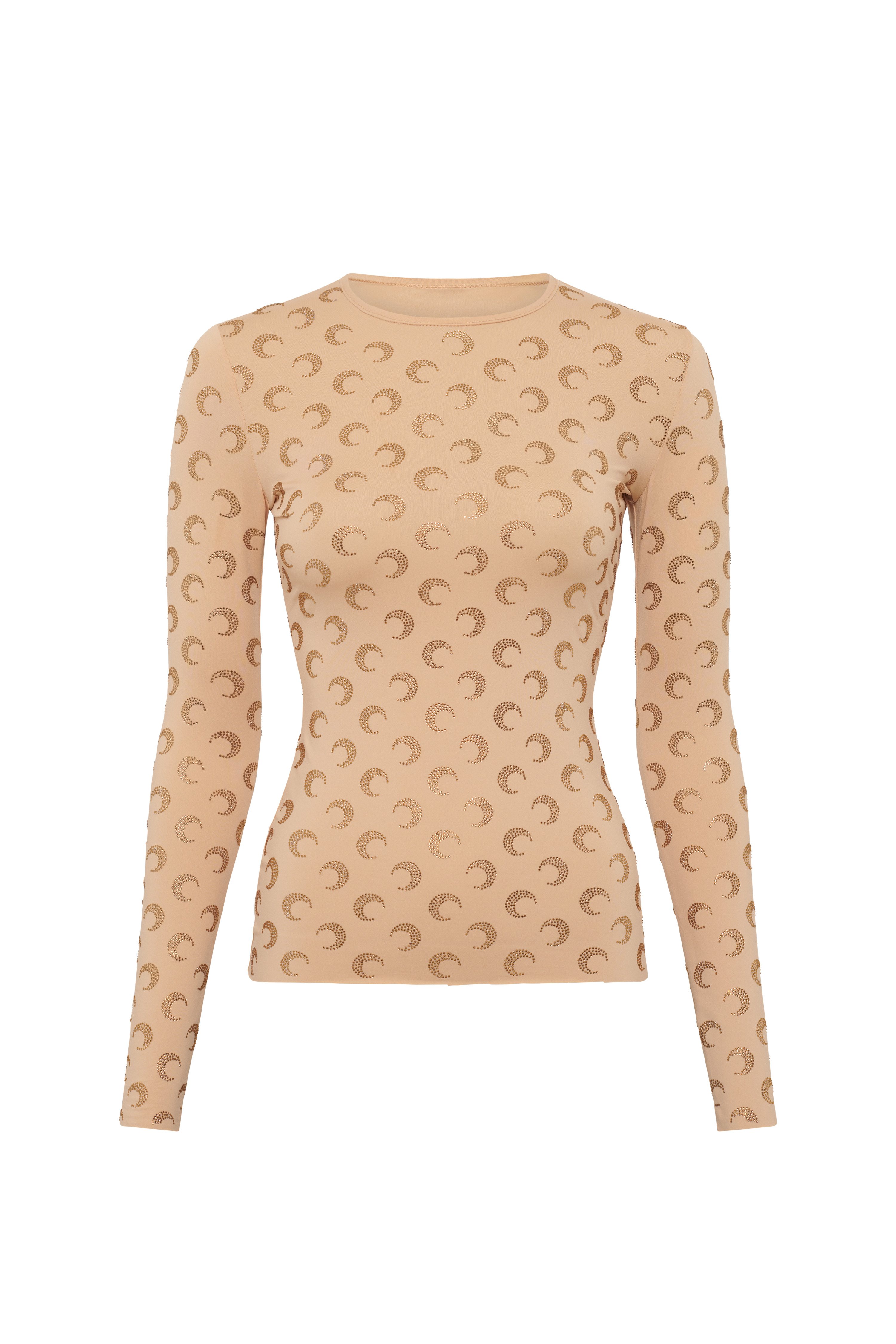 Second skin crewneck top with long sleeves The discount percentage displayed on Last Chance products is calculated based on the product's original selling price before markdowns. Product Detail - Signature Moon rhinestoned all over - Reinforced neckline - Cuffs and hem finished with raw edges Composition and Traceability Product details page relating to environmental qualities or characteristics WTS006A CJER0002 TA00 LIGHT TAN Composition: 88% Polyamide, 12% Elastane Recycled material: 88% (Polyamide) Releases plastic microfibers into the environment when washing Traceability: Weaving: Italy Dyeing, Manufacturing: India