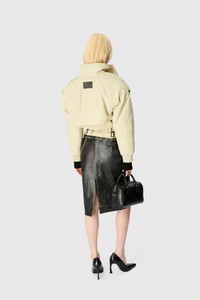 - HIDDEN ZIPPER AND SNAPS - TWO WELT POCKETS - RAGLAN SHOULDERS WITH SHOULDER PADS - ELASTICATED HEM AND CUFFS WITH STITCHING DETAILS - PLAIN LINING ON THE BODY - SIGNATURE MOON JACQUARD LINING ON THE SLEEVES - MARINE SERRE LEATHER PATCH Materials Regenerated Gabardine Twill