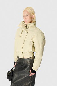 Boxy fit short-length bomber jacket with high neck and long sleeves Product Detail - Hidden zipper and snaps - Two welt pockets - Raglan shoulders with shoulder pads - Elasticated hem and cuffs with stitching details - Plain lining on the body - Signature moon jacquard lining on the sleeves - Marine Serre leather patch Composition and Traceability Product details page relating to environmental qualities or characteristics UJA069A_DWOV0090_BG10_LIGHT_BEIGE Composition: Main Fabric: 57% Cotton , 43% Polyamide - Lining: 100% Cotton - Second Lining: 100% Viscose Product Care: Do not machine wash Do not bleach Low temperature iron on reverse side Dry clean with precaution Do not tumble dry Traceability: Weaving, Dyeing, Manufacturing: Italy