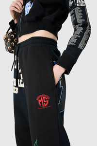 - Pockets finished with bartacks - Elasticated hem with stopper - Drawstring on the outside - Printed ms regenerated logo - Drawstrings with metal aglets - Upcycled sweatshirts patchwork construction Materials Regenrated Graphic Print Black Upcycled graphic t-shirts blend streetwear with feminine floral lace and recycled moon jersey inserts, each uniquely crafted. Pieces are pre-selected for seasonal colors through an artisanal regeneration process. Upcycled sweatshirts in black are deconstructed into mosaic prints, creating fresh designs while honoring originals. The range includes hoodies, sweatpants, shorts, and cropped sweatshirts, all uniquely marked with the ms regenerated logo. 50% CO, 50% PL
