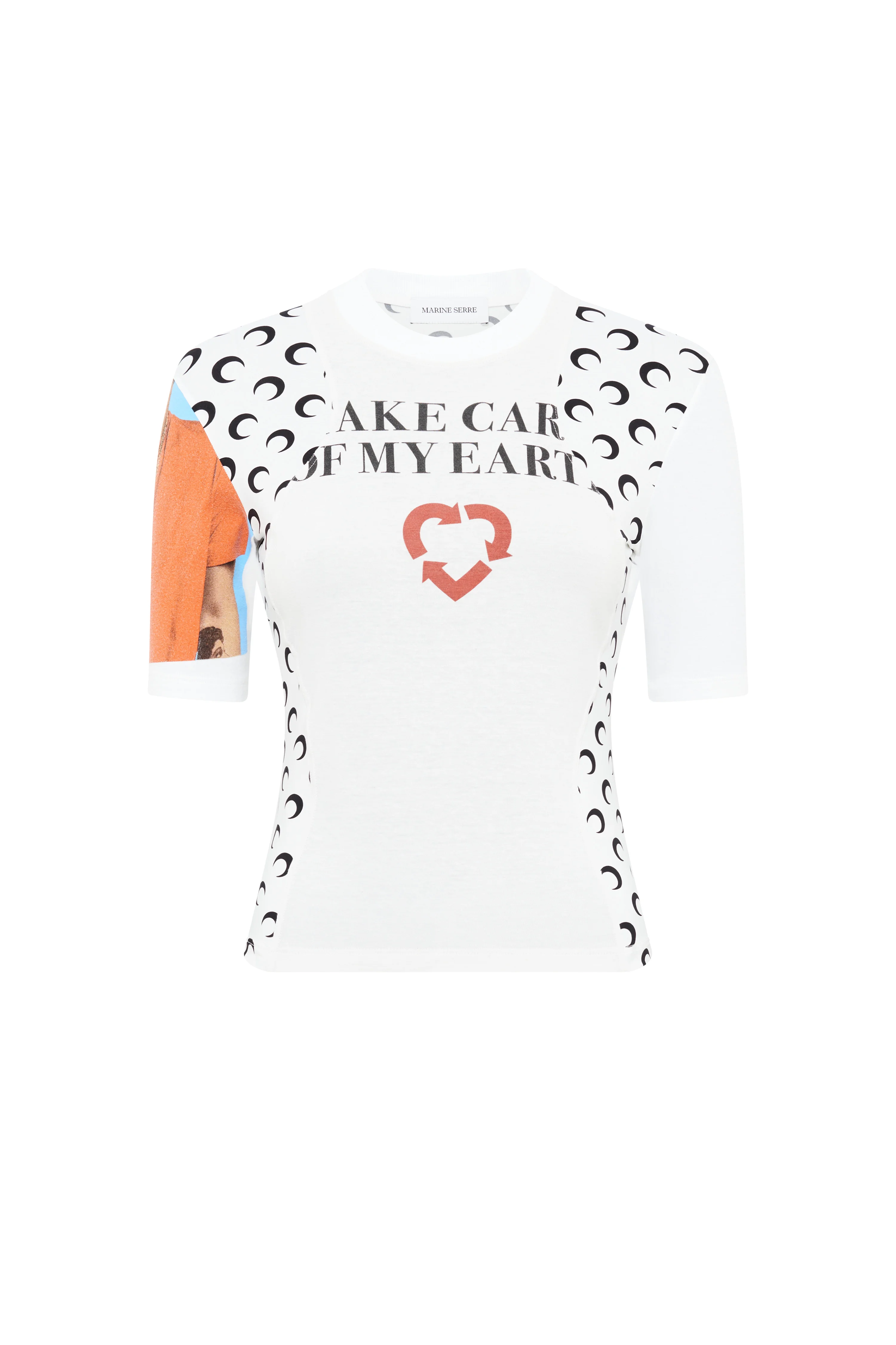 - Ribbed neckline - Patchwork construction - Signature Moon printed jersey cutout on sides and back - Vintage graphic print on front and right sleeve - Logo printed on lower back Materials Graphic T-shirt White T-shirts with graphics and logos: intergenerational, genderless, symbolic, they always convey a direct message, be it about sports, idols, concerts or political messages. 100% Cotton