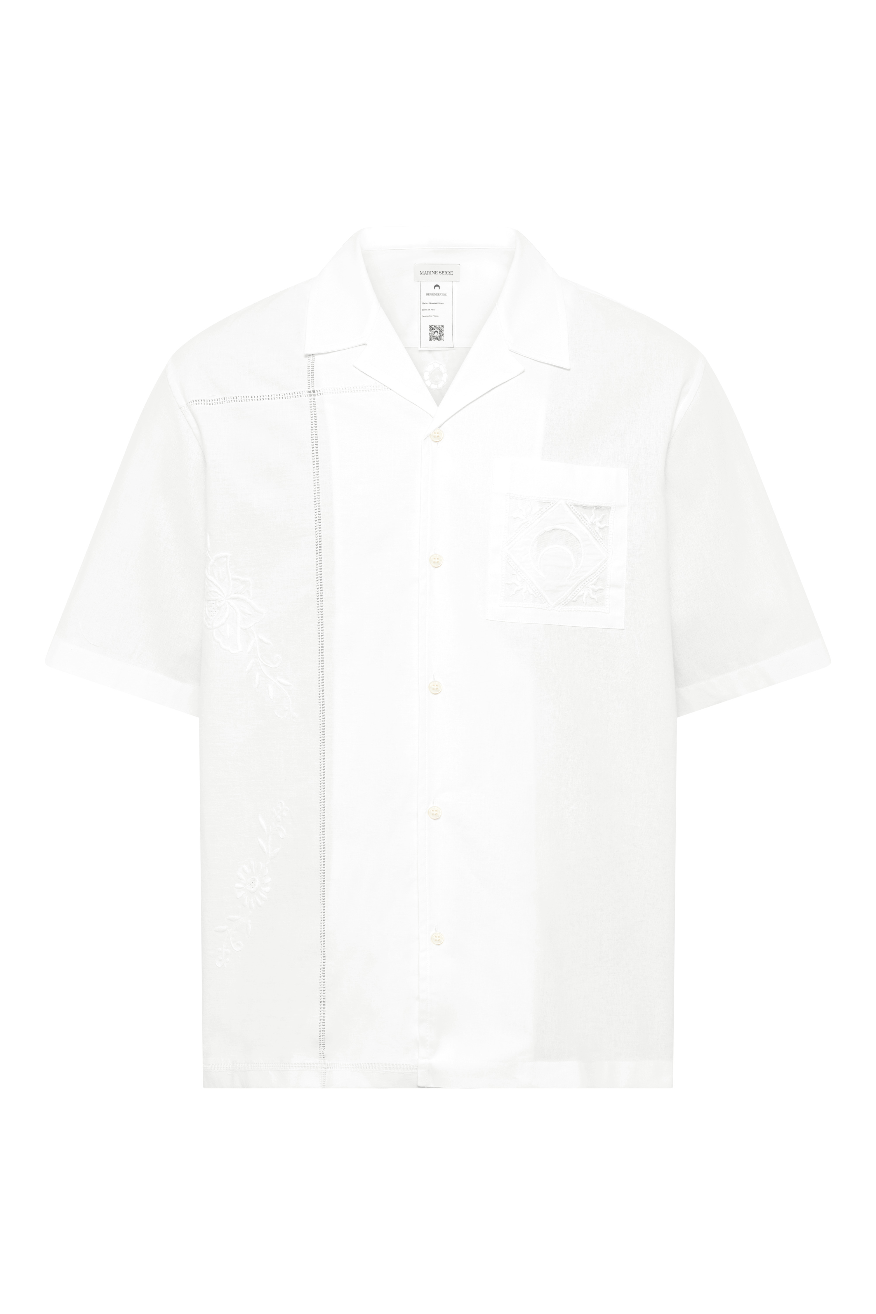 - Buttoned front - Applied pocket on left breast - Back yoke - Upcycled household linen embroideries in front - Pin hem - Lace branded patch embroidered on front pocket Materials Household Linen White Material : Pillowcases From & Date of Sourcing : UK, 1960s Place of Transformation : France This extraordinary fabric is part of the core materials of the House. The forgotten techniques of the upcycled embroidered household linen are saved from oblivion and regenerated into unique, transcending garments evoking soft, delicate and sensual imagery. All these one-of-a-kind pieces are filled with history through their embroideries, all smoothly placed to highlight the beauty of this rare fabric. The white tones of the pillowcases are also dyed in black to play with the ceremonial references. 100% Cotton