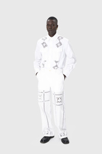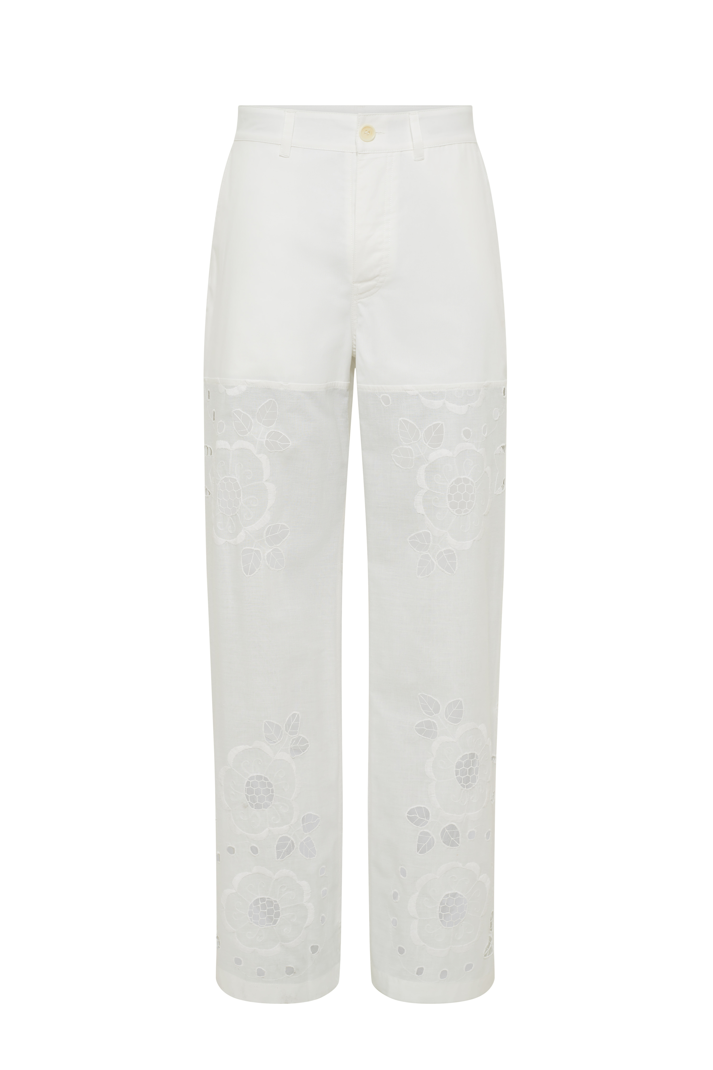 - Belt loops - Two italian side pockets - Lined upper - Upcycled household linen embroideries on bottom - Large hem - Lace branded patch embroidered on back pocket Materials Household Linen White Material : Pillowcases From & Date of Sourcing : UK, 1960s Place of Transformation : France This extraordinary fabric is part of the core materials of the House. The forgotten techniques of the upcycled embroidered household linen are saved from oblivion and regenerated into unique, transcending garments evoking soft, delicate and sensual imagery. All these one-of-a-kind pieces are filled with history through their embroideries, all smoothly placed to highlight the beauty of this rare fabric. The white tones of the pillowcases are also dyed in black to play with the ceremonial references. 100% Cotton