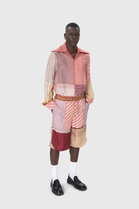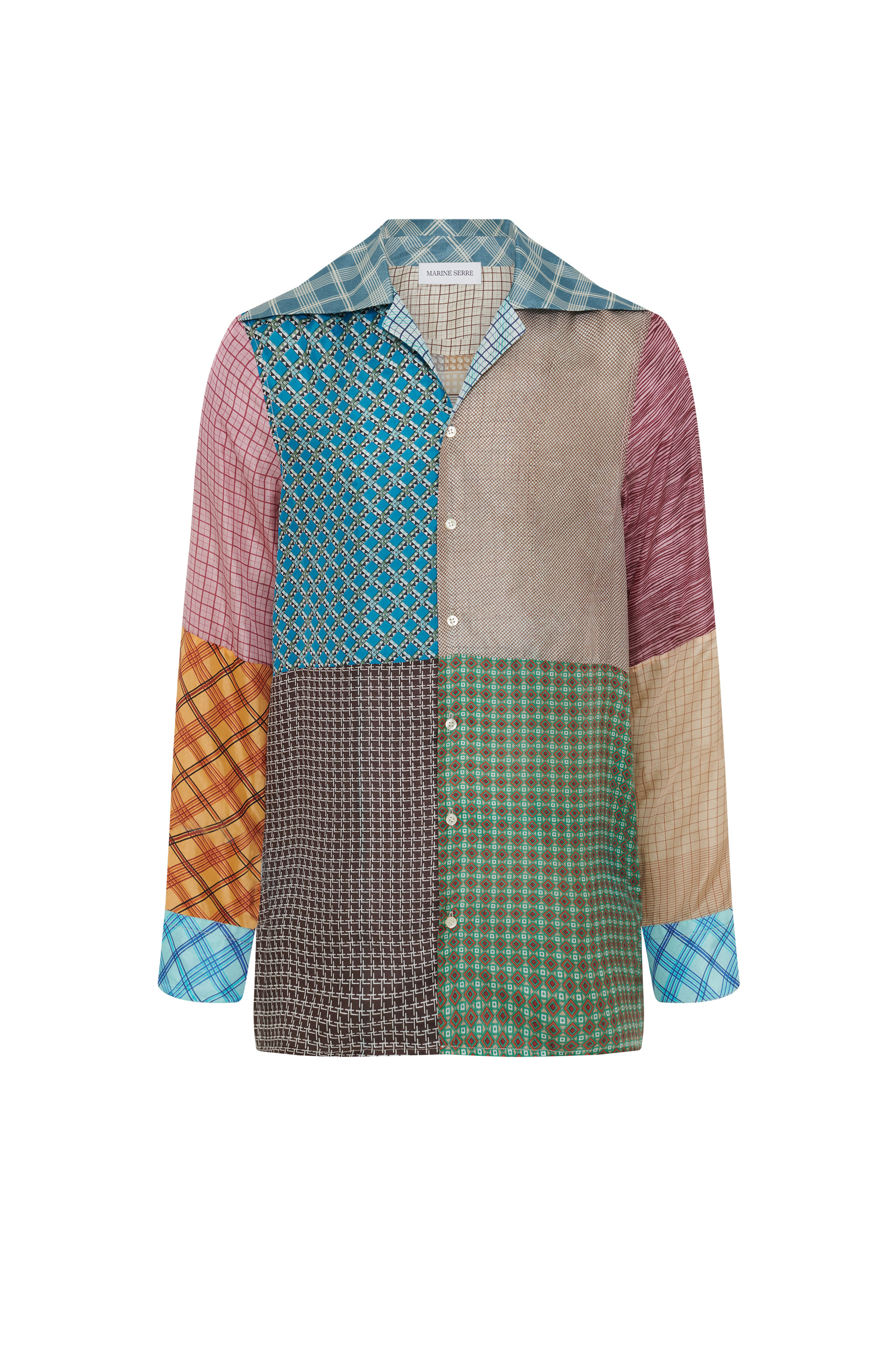 Unisex relaxed fit shirt with a flat pointy collar Product Detail - Collar finished with double topstitching - Buttoned front - Single button cuffs with pleated gathers - Side slit on right side - Back yoke - Pin hem - Upcycled silk scarves patchwork construction - Branded label woven at hem Composition and Traceability Product details page relating to environmental qualities or characteristics USI031A UWOV0028 MU00 MULTICOLOR Composition: 100% Silk Traceability: Material sourcing and upcycling country: Italy Manufacturing: France
