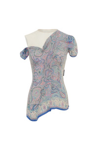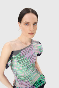 Fitted sleeveless trapped crewneck top Product Detail - Asymmetrical draping - Invisible zip closure on shoulder - Silk scarves 'escape' from mesh jersey at hem - Upcycled silk scarves draped within recycled mesh jersey - Turned hem Composition and Traceability Product details page relating to environmental qualities or characteristics WTO422A UWOV0028 MU00 MULTICOLOR Composition: 82% Polyamide, 18% Elastane, 100% Silk Traceability: Material sourcing and upcycling country: Italy Manufacturing: France
