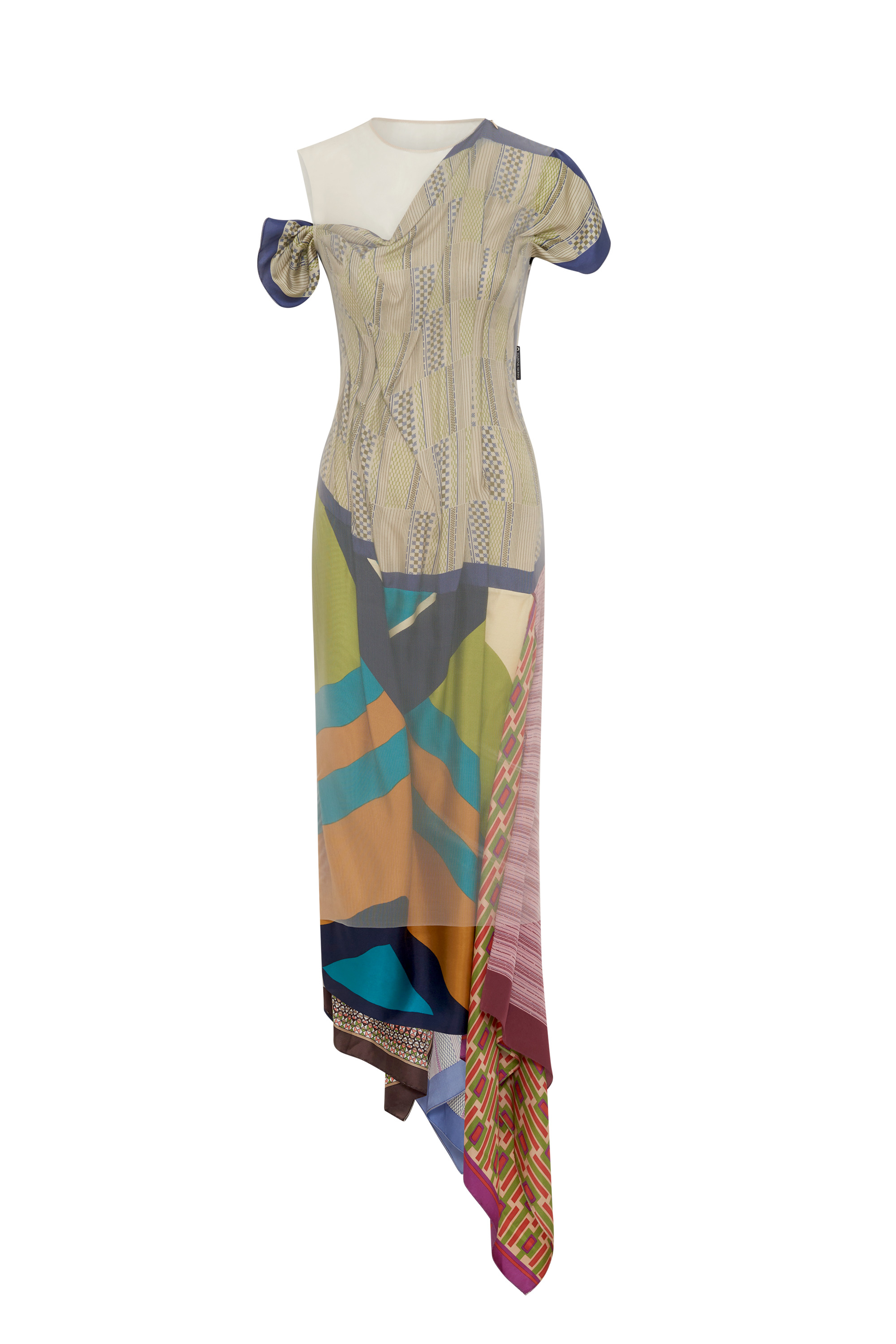 - Asymmetrical draping - Invisible zip closure on shoulder - Silk scarves 'escape' from mesh jersey at knee-length - Upcycled silk scarves draped within recycled mesh jersey - Turned hem Materials Regenerated Silk Scarves Regenerated from upcycled silk scarves, this fabric celebrates the beauty of vibrant prints, making it the brand's preferred light material. A selection of upcycled print silk scarves in countless shades is combined and merged to create ethereal designs that seamlessly blend into natural landscapes. 100% Silk