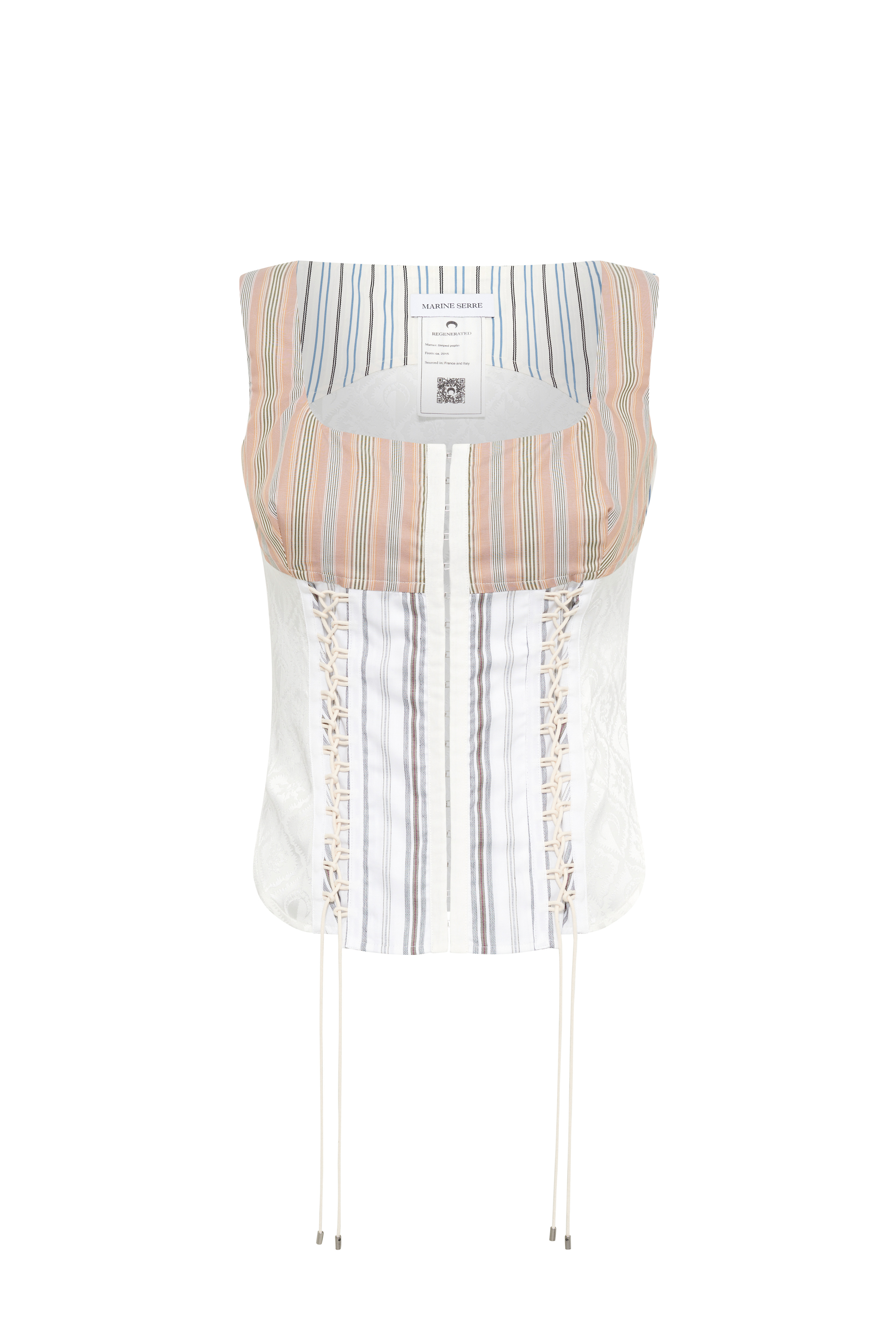 Adjustable fit regular length bustier top with an open neck and shoulder straps Crafted through an upcycling process, each piece is unique, with possible variations in shades The discount percentage displayed on Last Chance products is calculated based on the product's original selling price before markdowns. Product Detail - Hook and eye closure in front - Moon Sun stretch jersey for the lower back - Adjustable straps in front - Darted back - Crocheted Moon logo on upper back Composition and Traceability Product details page relating to environmental qualities or characteristics WTO410A DWOV0061 BG20 BEIGE Composition: Base Material: 100% Cotton - Secondary Fabric: 100% Cotton - Third Fabric: 64% Acetate, 35% Viscose, 1% Elastane Traceability: Sourcing and upcycling country: France and Italy Manufacturing: Romania