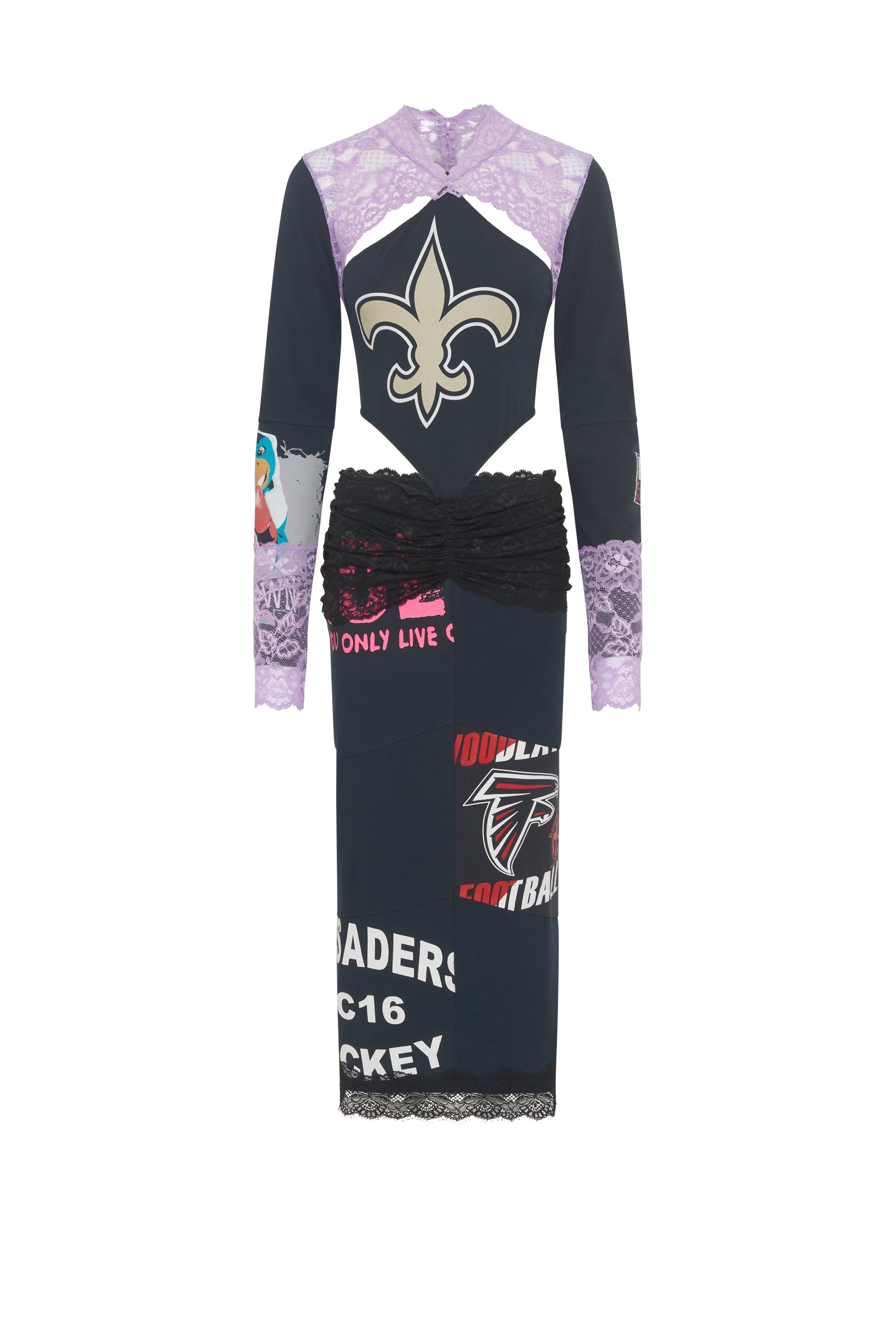 - Button closing system at the back of the collar - Upcycled t-shirts and lace hybrid construction - MS REGENERATED logo printed on bottom left Materials Graphic T-Shirt Black T-shirts with graphics and logos: intergenerational, genderless, symbolic, they always convey a direct message, be it about sports, idols, concerts or political messages. Matter: Graphic T-shirts 100% Cotton, ca. 2010, sourced in Netherlands