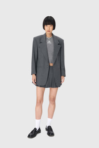 Unisex relaxed fit boxy single-breasted jacket with a notch lapel collar and padded shoulders The discount percentage displayed on Last Chance products is calculated based on the product's original selling price before markdowns. Product Detail - Single button front closure - Enameled signature Moon button - One chest pocket and two side flap pockets - Interior pockets - Shoulder pads - Rear vent - Signature Moon jacquard lining - MS Tailor label single stitched on back yoke Composition and Traceability Product details page relating to environmental qualities or characteristics UJA066A DWOV0057 GR50 GREY Composition: Base Material: 52% Polyester, 45% Virgin Wool, 3% Elastane - Lining: 100% Viscose - Secondary Fabric: 70% Wool, 30% Viscose Releases plastic microfibers into the environment when washing Traceability: Material sourcing and upcycling country and Manufacturing: Italy