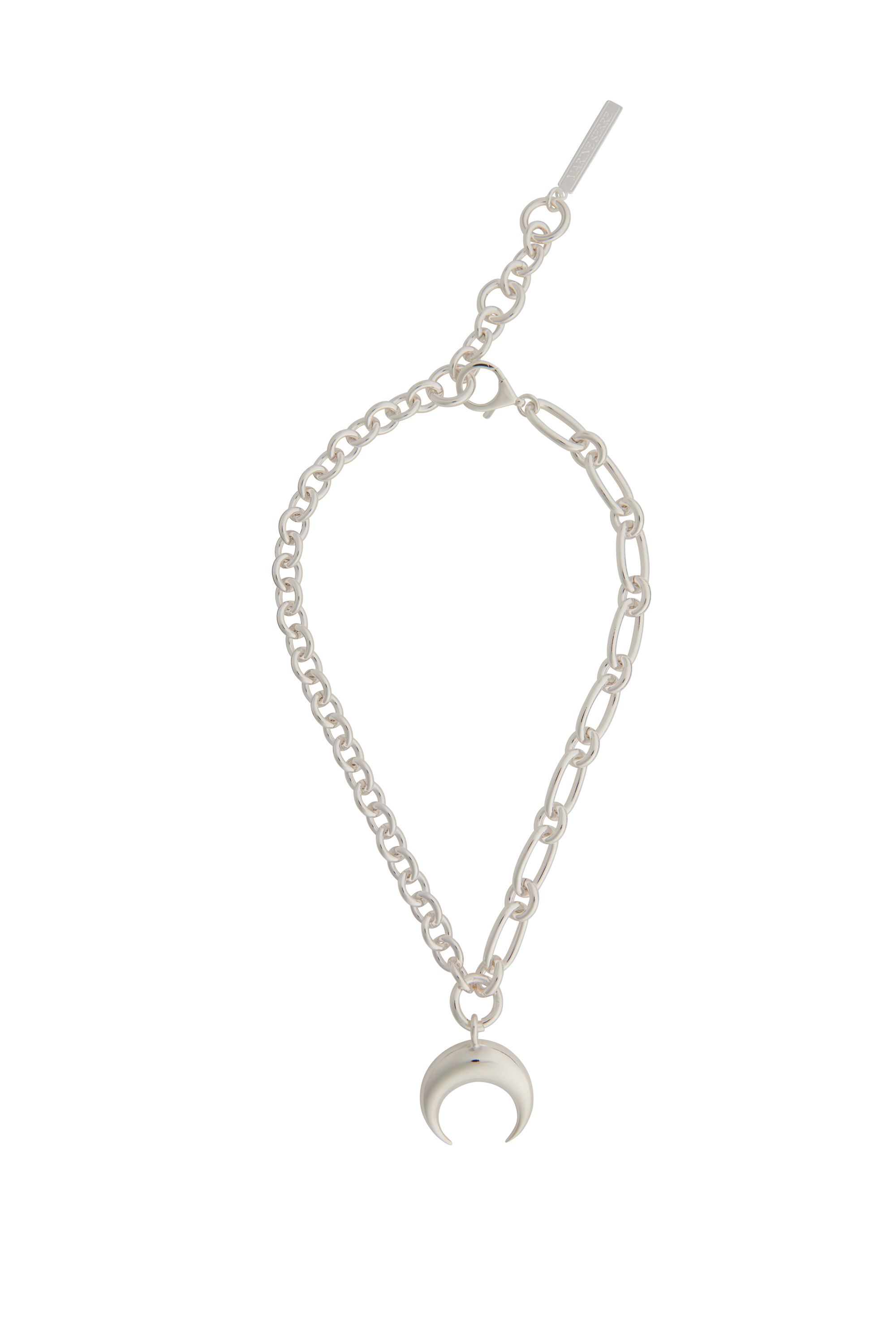 Crafted from brass and recycled pewter, this Moon charm necklace with chains becomes the perfect accessory for adding an edgy flair to any outfit. MARINE SERRE jewelry is imagined and prototyped in the heart of the House and then made by French craftsmen. This necklace showcases a recycled pewter pendant. Materials Pewter Silver 100% Pewter 100% Pewter