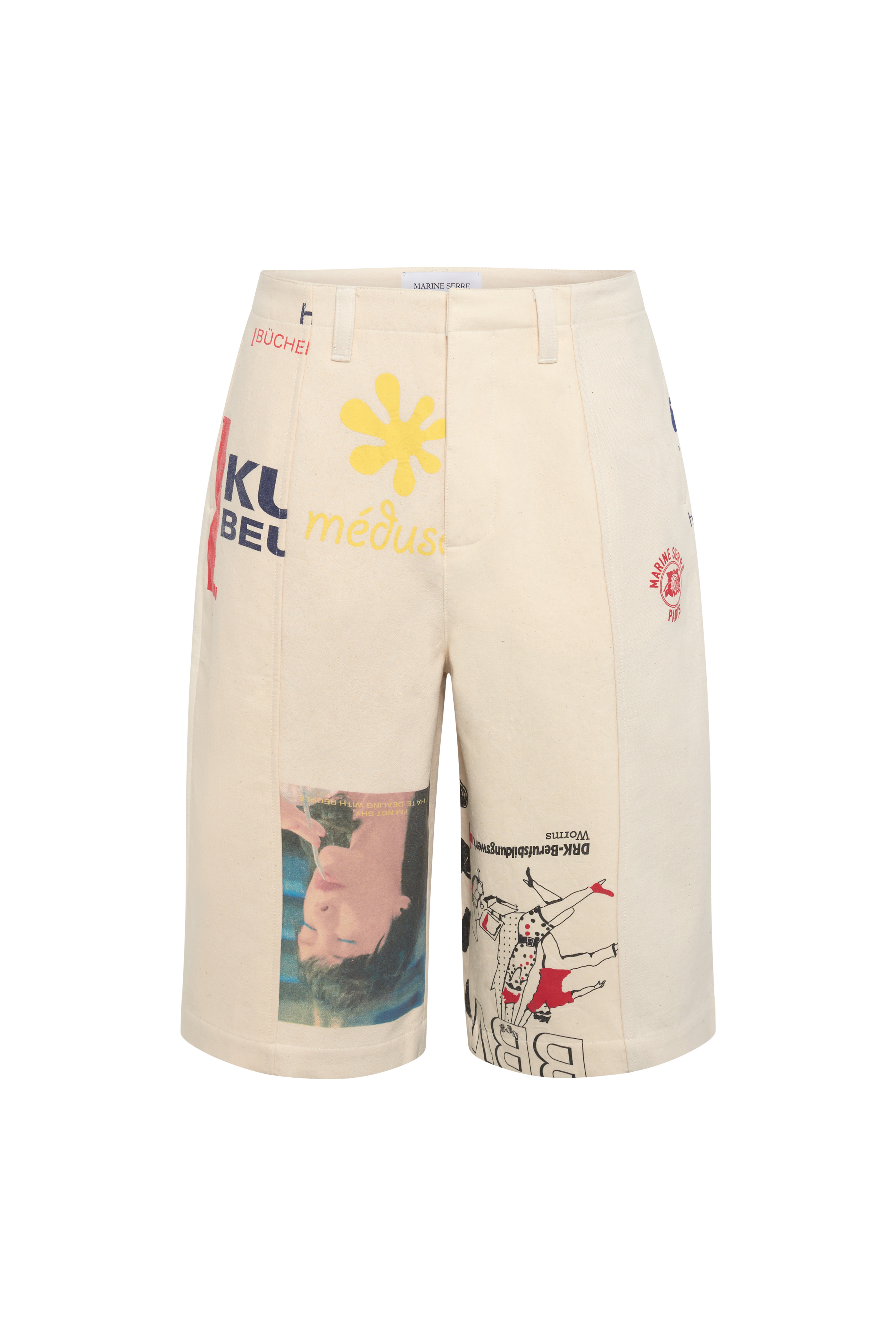 - Invisible zip and hook closure front - Belt loops - Front pleats - Two side pockets and rear welted pockets - Upcycled totebags panelled construction - MS artworks printed on left side Materials Regenerated Tote Bags Marine Serre first showed upcycled tote bags in the F/W 2023 Collection Rising Shelter, which made waves with its column-shaped cages of discarded clothing. Inspired by the designer’s optimism despite rapid climate change, this range begins life with the careful selection of cotton totes according to their quality and the appeal of their multicultural patterns. Reimagined as Marine Serre Couture pieces, their sui generis graphics leap out from the ecru fabric, tapping into the longing for travel that underpins the entire collection, as each carries different places and stories within it. Unisex garments are inflected by streetwear styles. There’s a bomber jacket with a generous volume, alongside wide workwear pants, button-up and bowling shirts, and tailored shorts. A standout trench features the tote’s handles hanging down its back. For women, the bustier present in the Regenerated Denim range introduces a pleasing clash between the material and the sensual bodycon design. Pieces feature a printed Marine Serre logo and, owing to the upcycling approach, each is one of a kind.